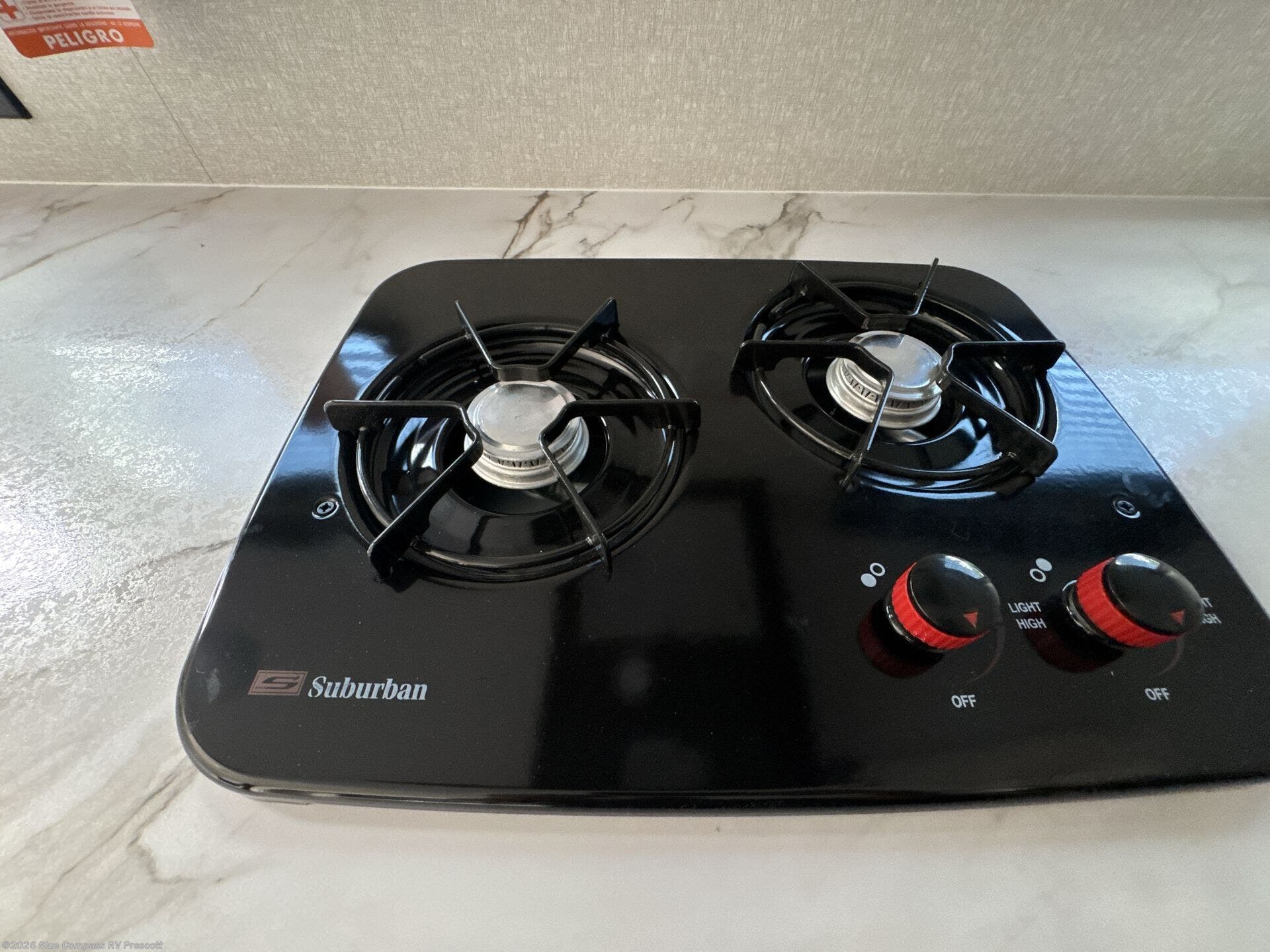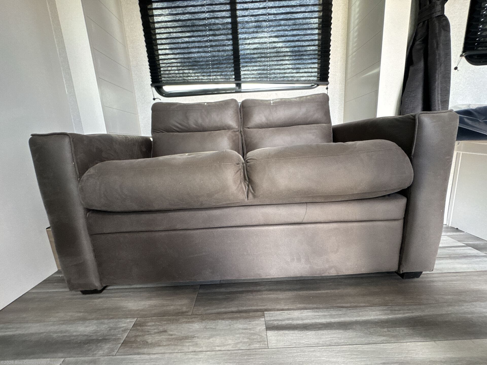 This single-axle couple's travel trailer is sure to bring you happiness at the campground. There is a front queen bed with a privacy curtain if you have a guest staying over on the jack-knife sofa, and the movable table in front of the sofa will provide more floor space when needed. A cooktop and microwave oven will let you make meals each day, and an 8 cu. ft. 12V refrigerator will be perfect for perishables. This model also includes a full rear bath with a shower, a toilet, plus a sink and a linen closet for clean towels.