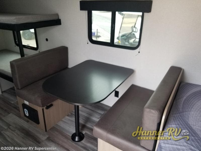 Your crew of five will love camping in this single-axle travel trailer! There are bunk beds in the rear corner and a full bath in the other rear corner for easy nighttime use. You will have the front queen bed to yourselves, along with an overhead shelf and a nightstand/wardrobe for your clothes. The booth dinette provides a place to dine, play games, and even let an extra guest stay over. The Customer Value Package on this Sport Edition model includes a 19K BTU furnace, stabilizer jacks, a power awning, an entry door with a window and shade prep, and many more stand-out features!
