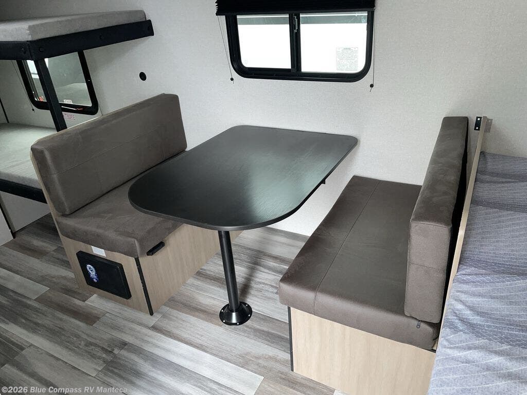 Your crew of five will love camping in this single-axle travel trailer! There are bunk beds in the rear corner and a full bath in the other rear corner for easy nighttime use. You will have the front queen bed to yourselves, along with an overhead shelf and a nightstand/wardrobe for your clothes. The booth dinette provides a place to dine, play games, and even let an extra guest stay over. The Customer Value Package on this Sport Edition model includes a 19K BTU furnace, stabilizer jacks, a power awning, an entry door with a window and shade prep, and many more stand-out features!