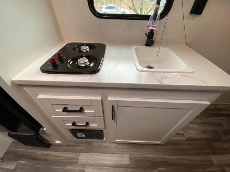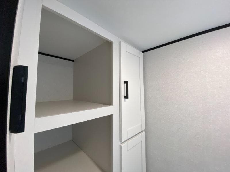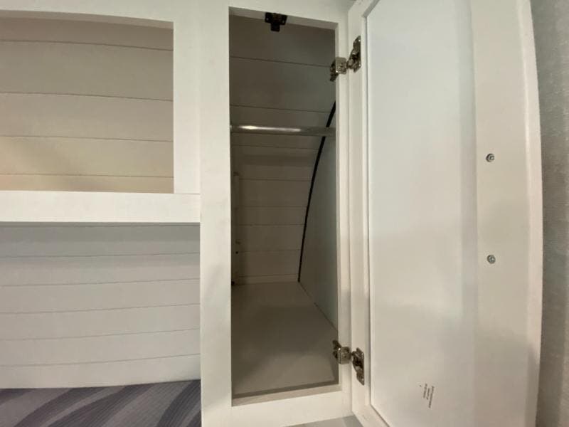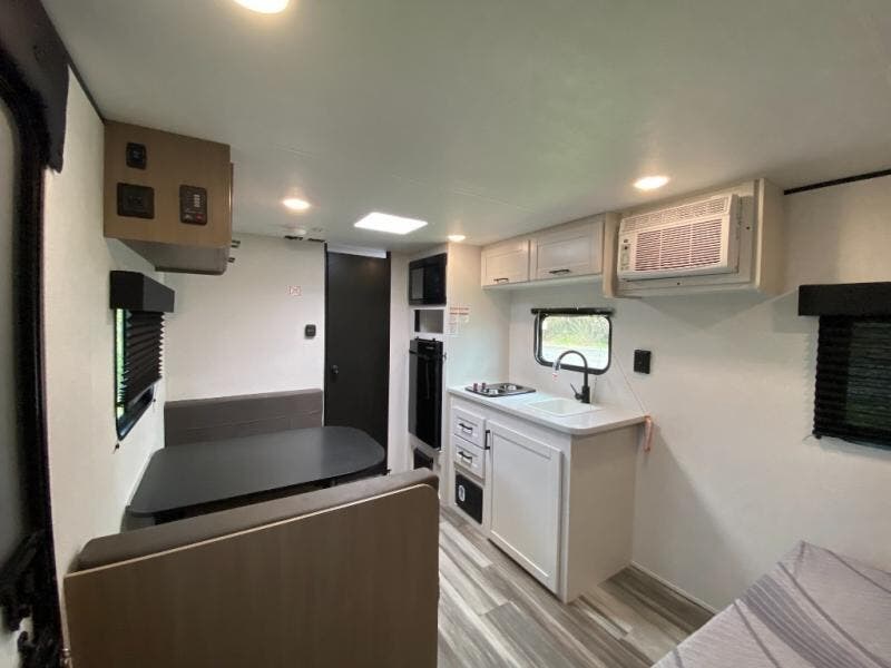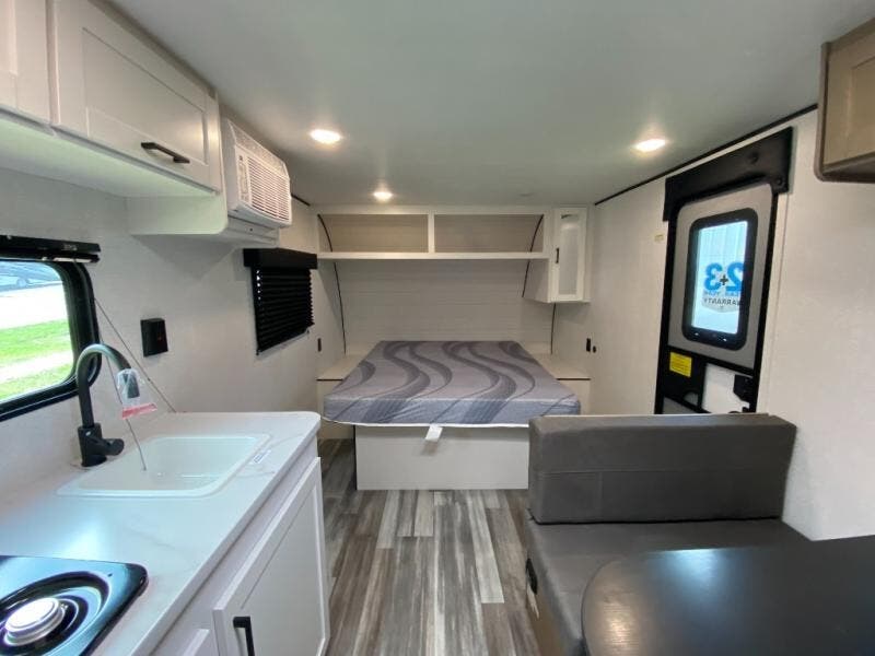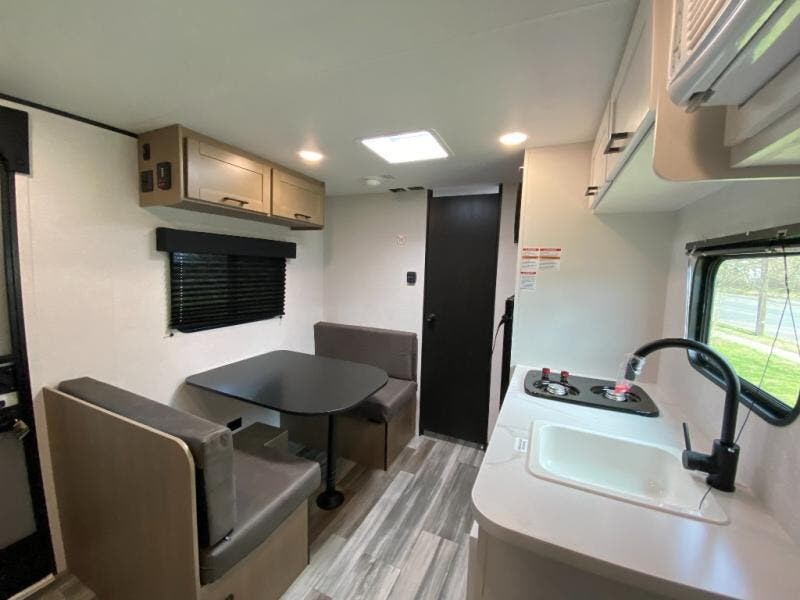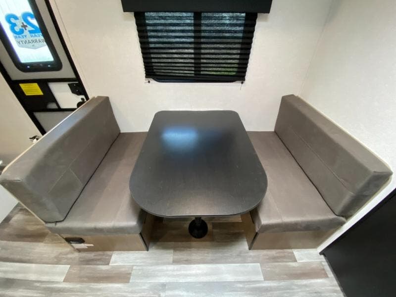 This travel trailer includes everything you need for fun trips at the lake. When you arrive at the campground, you can unload the exterior storage, then put out the 10' power awning. The booth dinette inside will provide a place to dine together, and the full rear bath with a shower will make it easier than ever to clean up after a day of hiking. A front RV queen bed will provide a great night's rest, and the overhead shelf will be perfect for books or personal belongings.