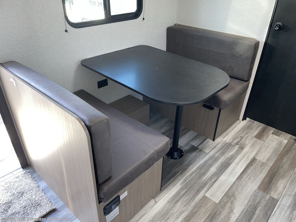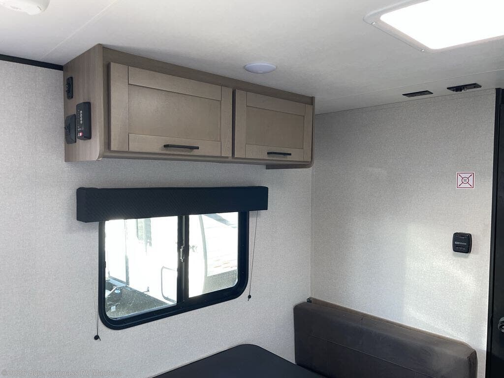 This travel trailer includes everything you need for fun trips at the lake. When you arrive at the campground, you can unload the exterior storage, then put out the 10' power awning. The booth dinette inside will provide a place to dine together, and the full rear bath with a shower will make it easier than ever to clean up after a day of hiking. A front RV queen bed will provide a great night's rest, and the overhead shelf will be perfect for books or personal belongings.