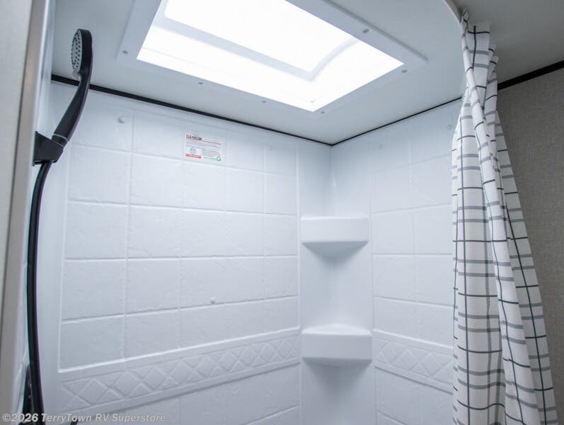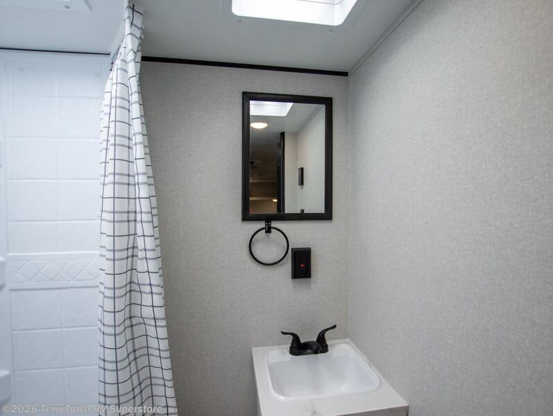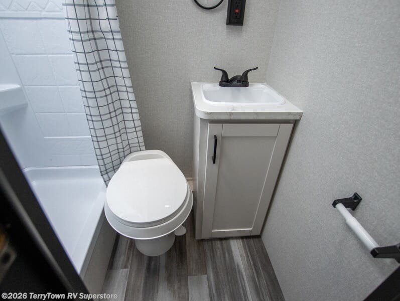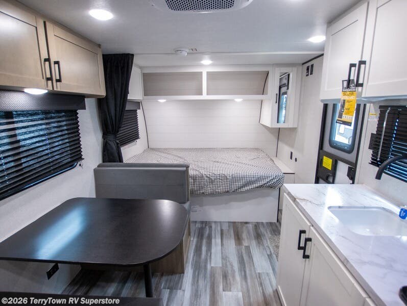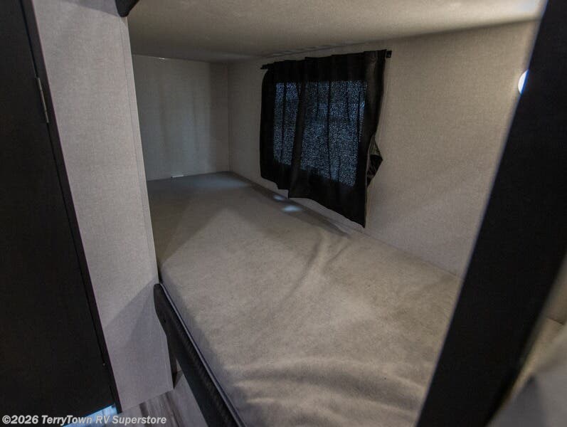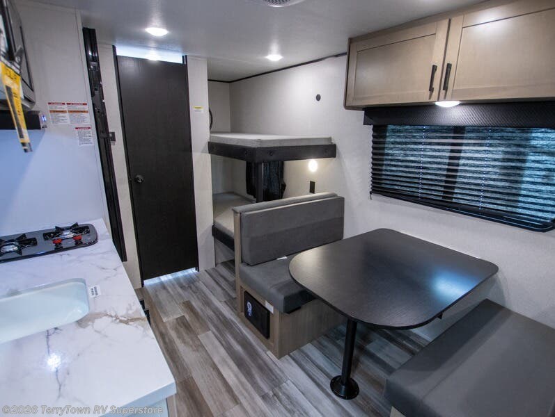 Your crew of five will love camping in this single-axle travel trailer! There are bunk beds in the rear corner and a full bath in the other rear corner for easy nighttime use. You will have the front queen bed to yourselves, along with a privacy curtain, overhead shelf, and a nightstand/wardrobe for your clothes. The booth dinette provides a place to dine, play games, and even let an extra guest stay over. The optional STX Edition can be added on this model which includes 16 in. off-road tires, triple entry steps, a power tongue jack, and more!