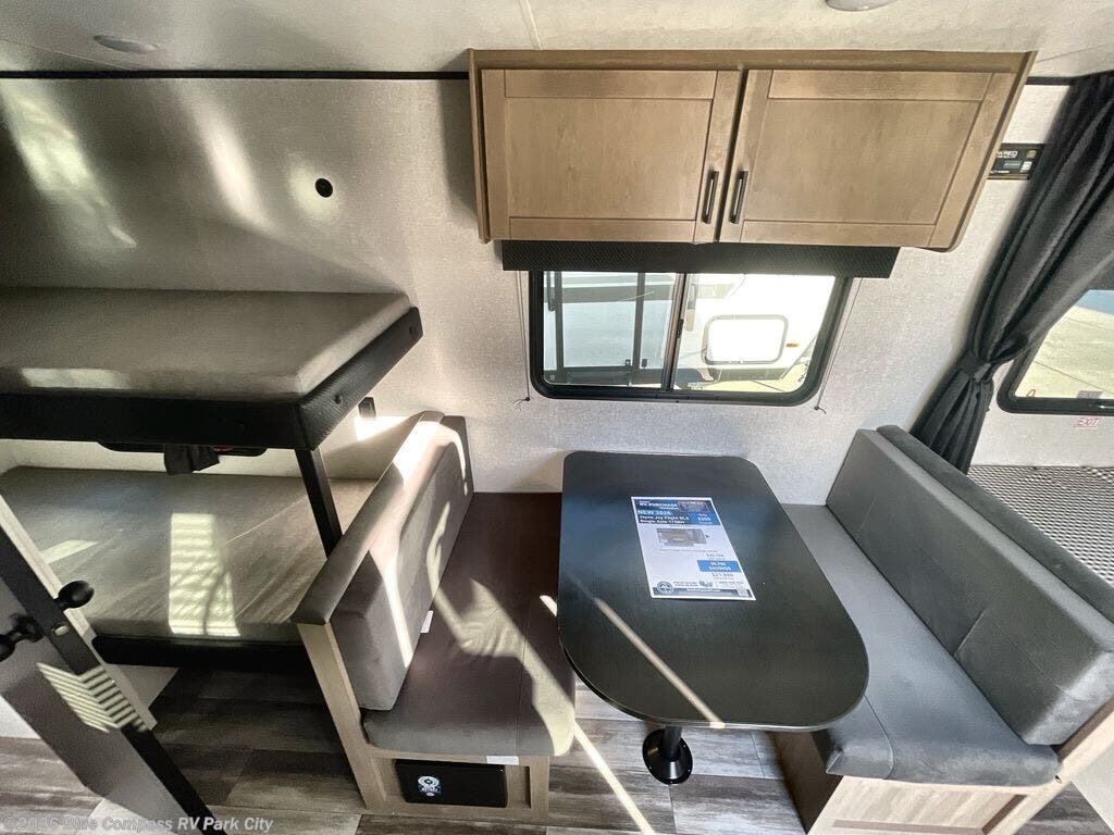 Your crew of five will love camping in this single-axle travel trailer! There are bunk beds in the rear corner and a full bath in the other rear corner for easy nighttime use. You will have the front queen bed to yourselves, along with a privacy curtain, overhead shelf, and a nightstand/wardrobe for your clothes. The booth dinette provides a place to dine, play games, and even let an extra guest stay over. The optional Baja Package can be added on this model which includes 16 in. off-road tires, a deluxe graphics package, triple entry steps, and more!