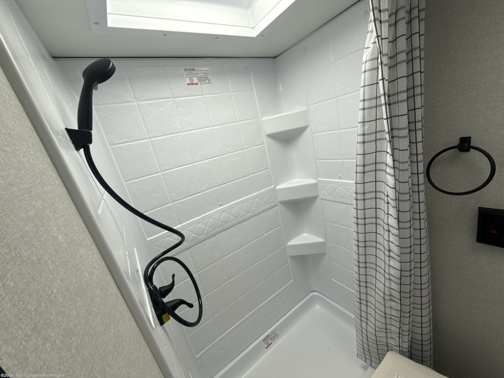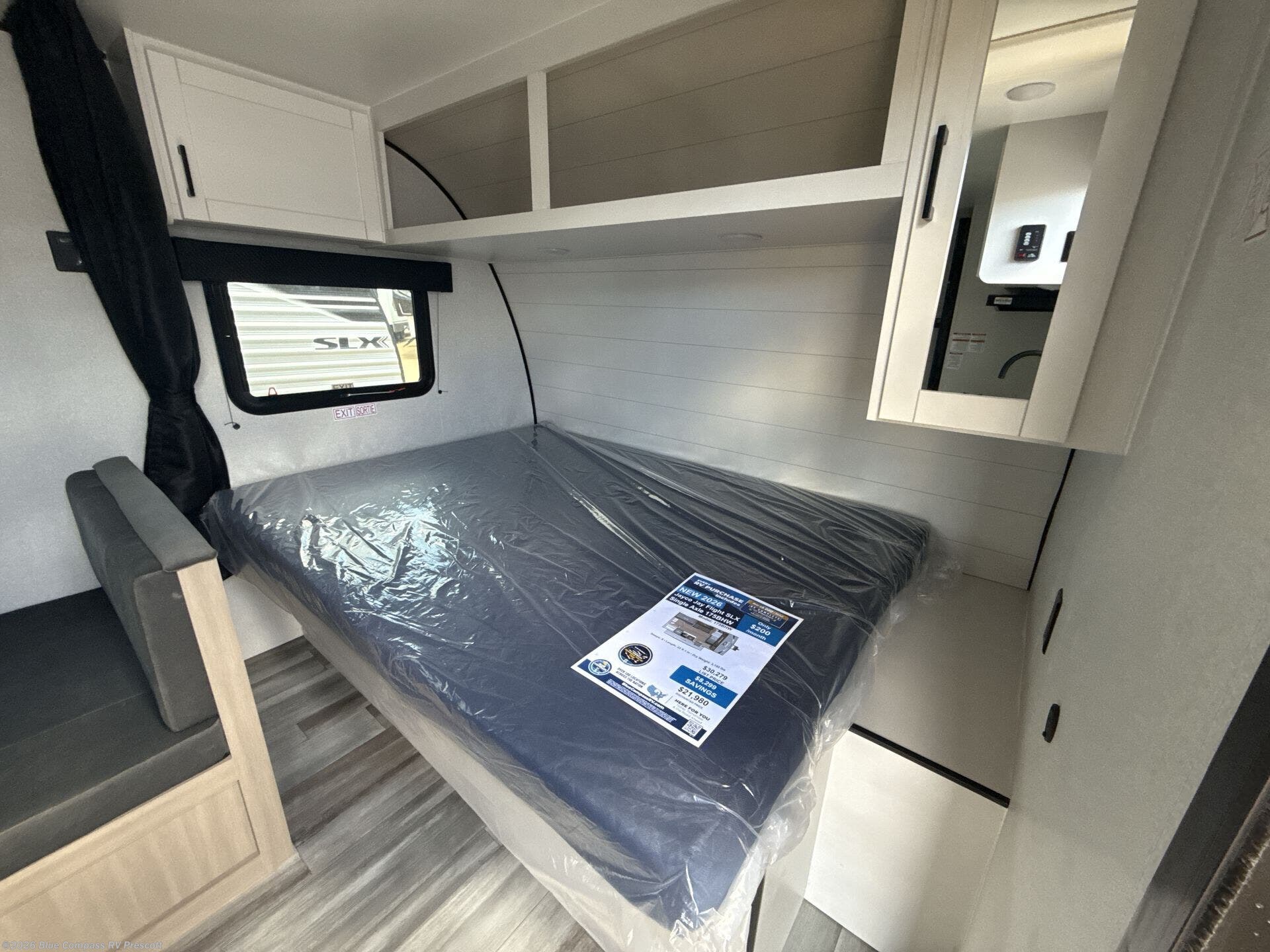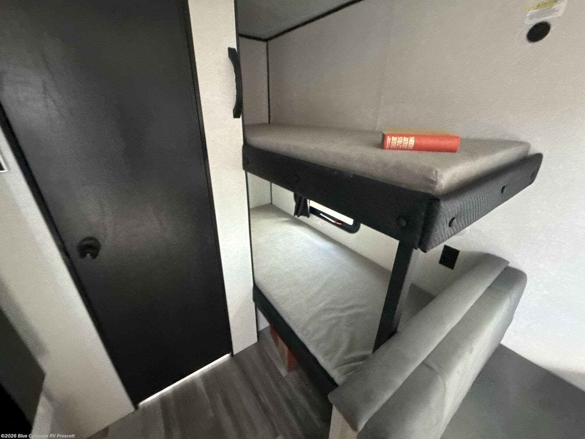 Your crew of five will love camping in this single-axle travel trailer! There are bunk beds in the rear corner and a full bath in the other rear corner for easy nighttime use. You will have the front queen bed to yourselves, along with a privacy curtain, overhead shelf, and a nightstand/wardrobe for your clothes. The booth dinette provides a place to dine, play games, and even let an extra guest stay over. The optional Baja Package can be added on this model which includes 16 in. off-road tires, a deluxe graphics package, triple entry steps, and more!
