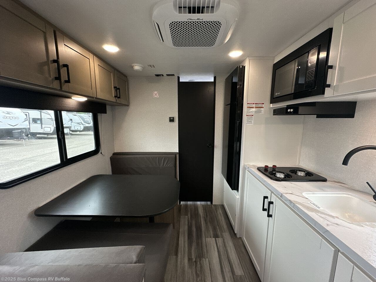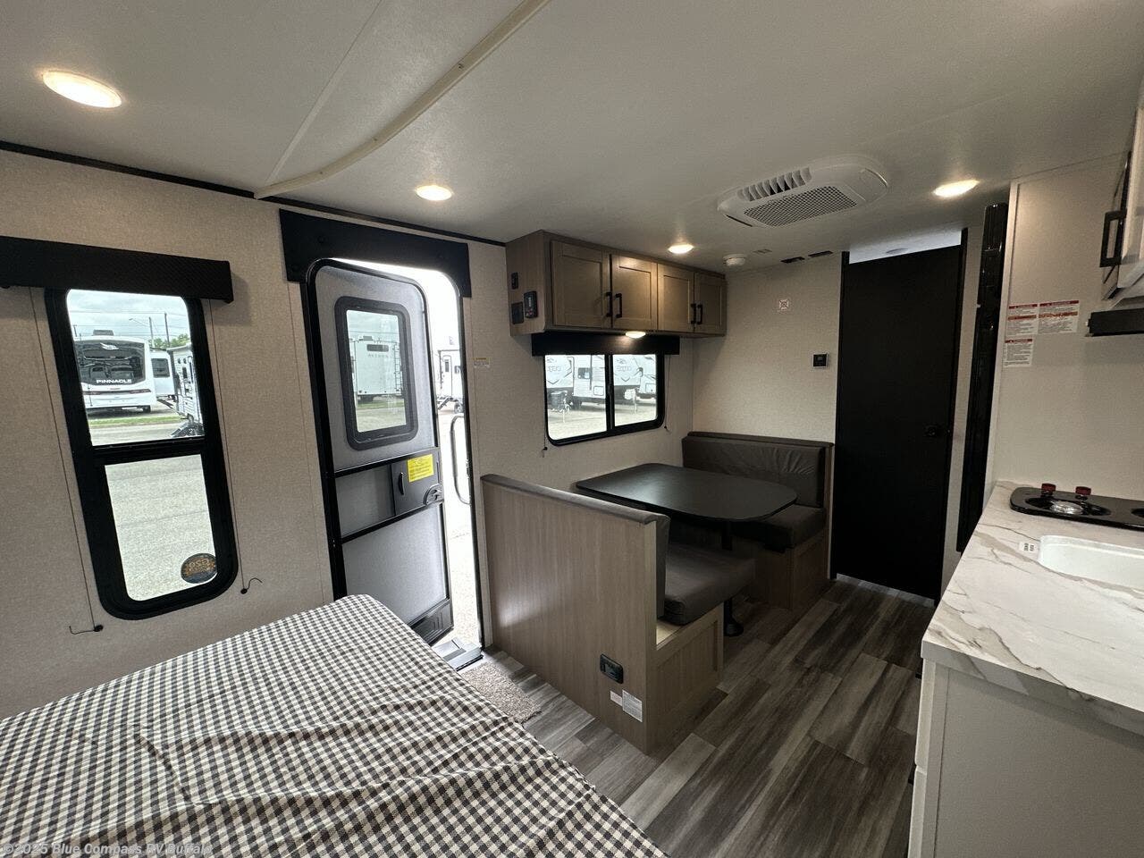 This travel trailer includes everything you need for fun trips at the lake. When you arrive at the campground, you can unload the exterior storage, then put out the 12' power awning with LED lights. There is also an LP Quick Connect if you want to hook up your own grill! The booth dinette inside will provide a place to dine together, and the full rear bath with a tub/shower will make bath time easier than ever for little ones. A front RV queen bed will provide a great night's rest, and the privacy curtain will be appreciated when you're getting dressed in the morning.