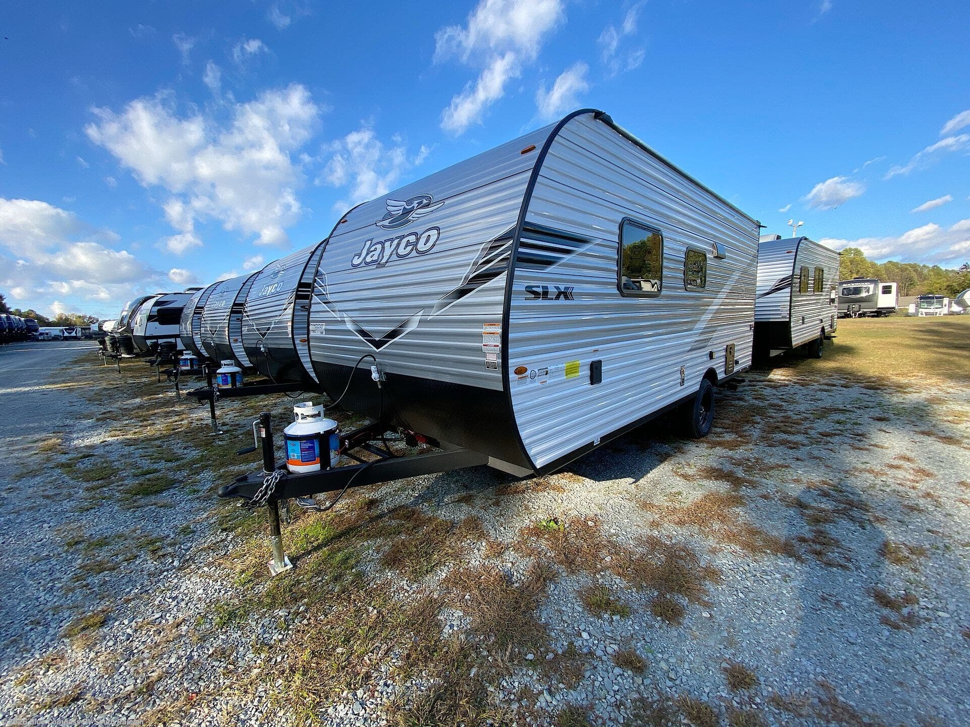 The Jayco Jay Flight SLX travel trailer is quite easy to own because it is lightweight for an easier towing experience. Built on a fully integrated A-frame with galvanized-steel, impact-resistant wheel wells, the Jay Flight SLX has quality at its very foundation. That quality continues on to the electric self-adjusting brakes, easy-lube hubs, Magnum Truss roof system, and LP quick connect. Some of what the mandatory Customer Value Package includes is backup camera prep, Keyed-Alike entry and baggage doors, and an on-demand tankless water heater.
