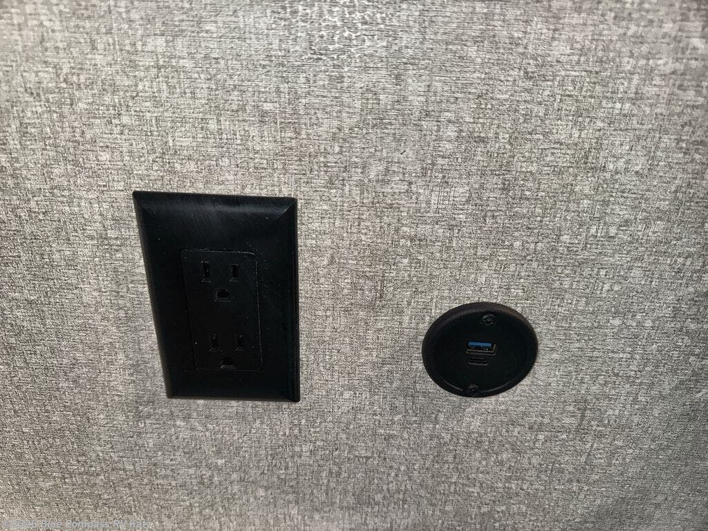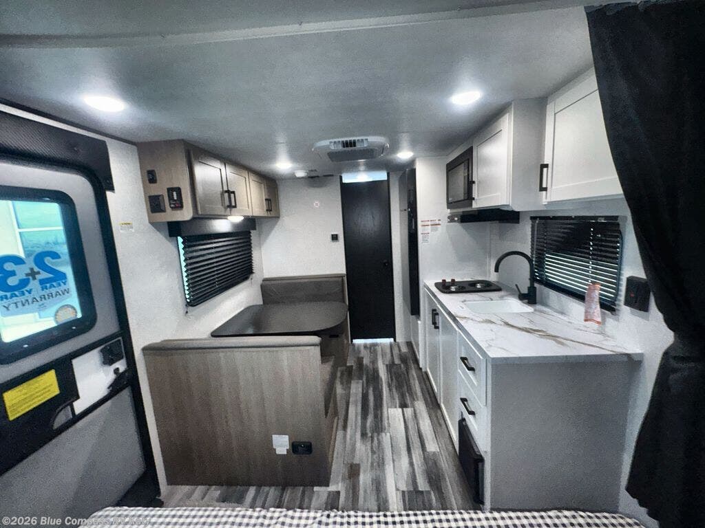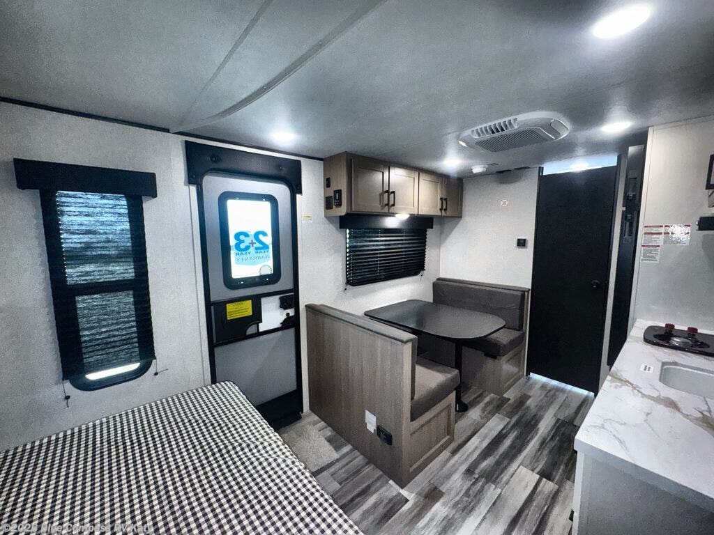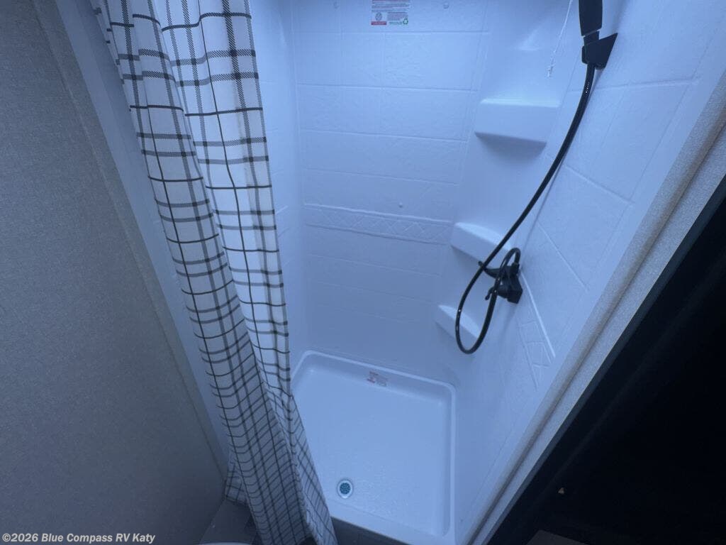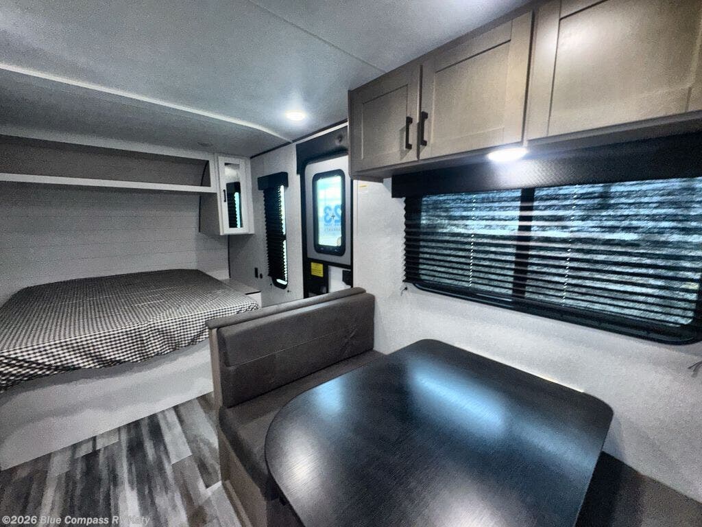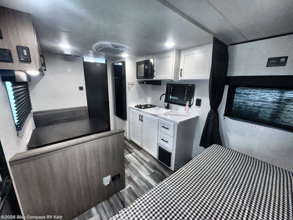 This travel trailer includes everything you need for fun trips at the lake. When you arrive at the campground, you can unload the exterior storage, then put out the 12' power awning with LED lights. There is also an LP Quick Connect if you want to hook up your own grill! The booth dinette inside will provide a place to dine together, and the full rear bath with a tub/shower will make bath time easier than ever for little ones. A front RV queen bed will provide a great night's rest, and the privacy curtain will be appreciated when you're getting dressed in the morning.