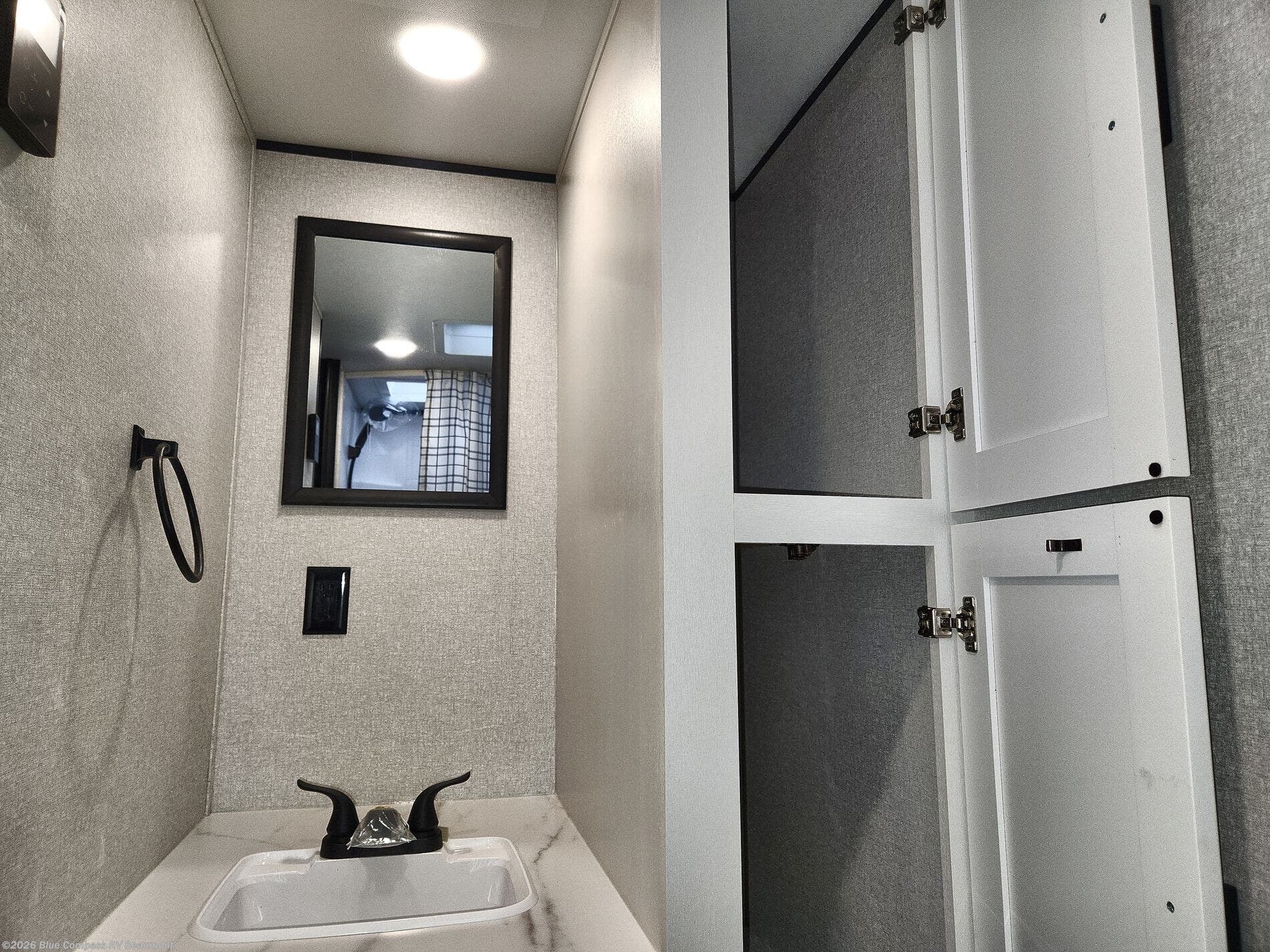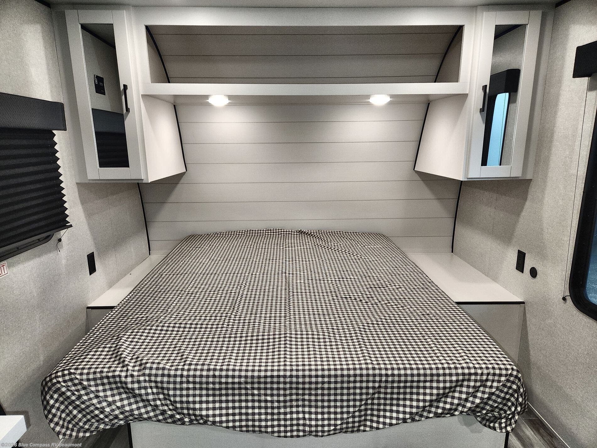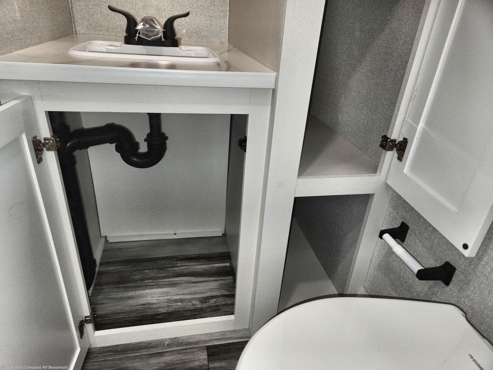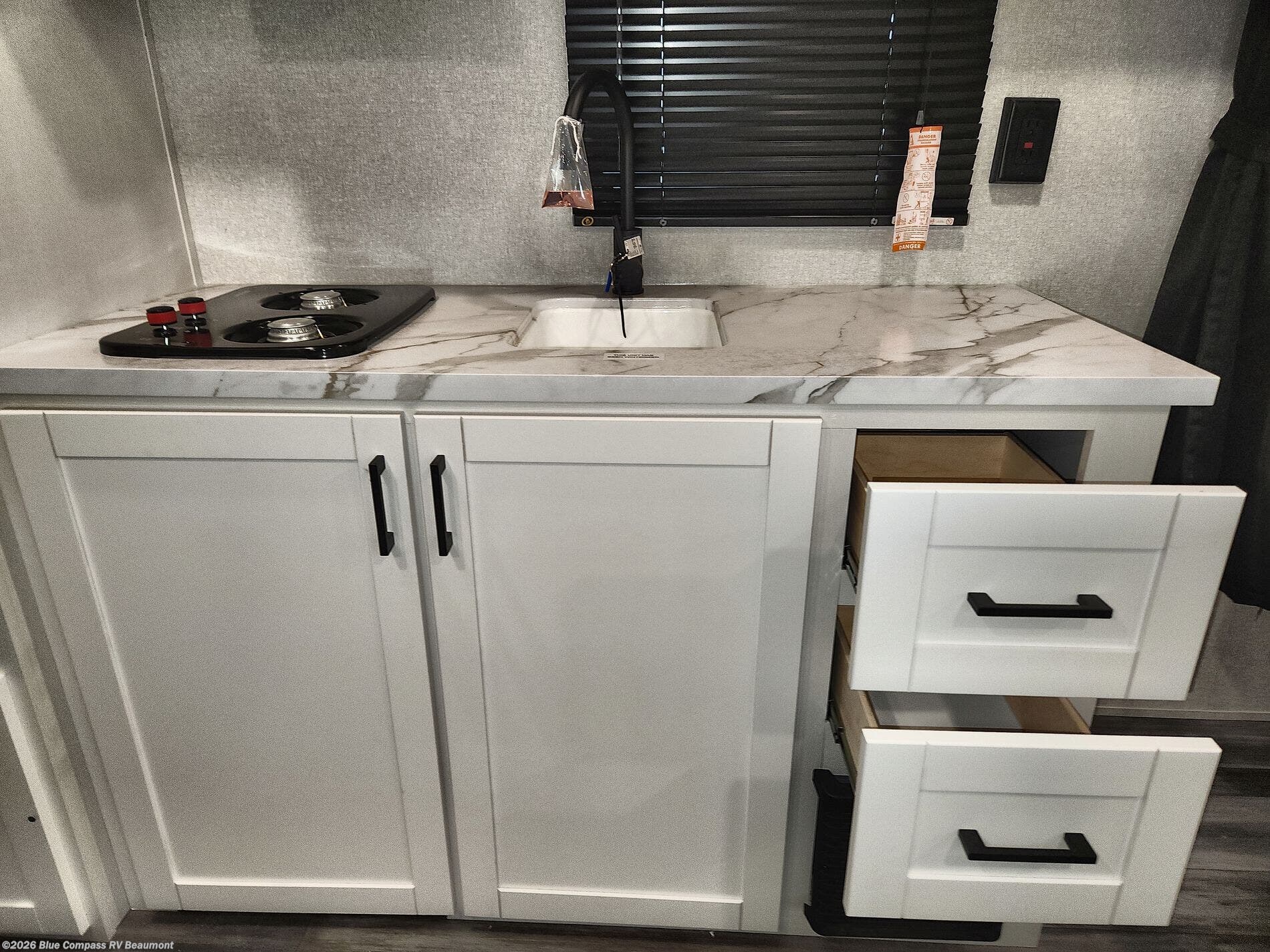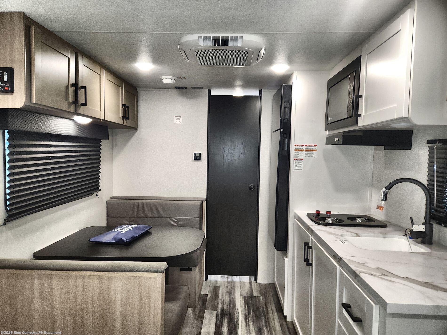 This travel trailer includes everything you need for fun trips at the lake. When you arrive at the campground, you can unload the exterior storage, then put out the 12' power awning with LED lights. There is also an LP Quick Connect if you want to hook up your own grill! The booth dinette inside will provide a place to dine together, and the full rear bath with a tub/shower will make bath time easier than ever for little ones. A front RV queen bed will provide a great night's rest, and the privacy curtain will be appreciated when you're getting dressed in the morning.