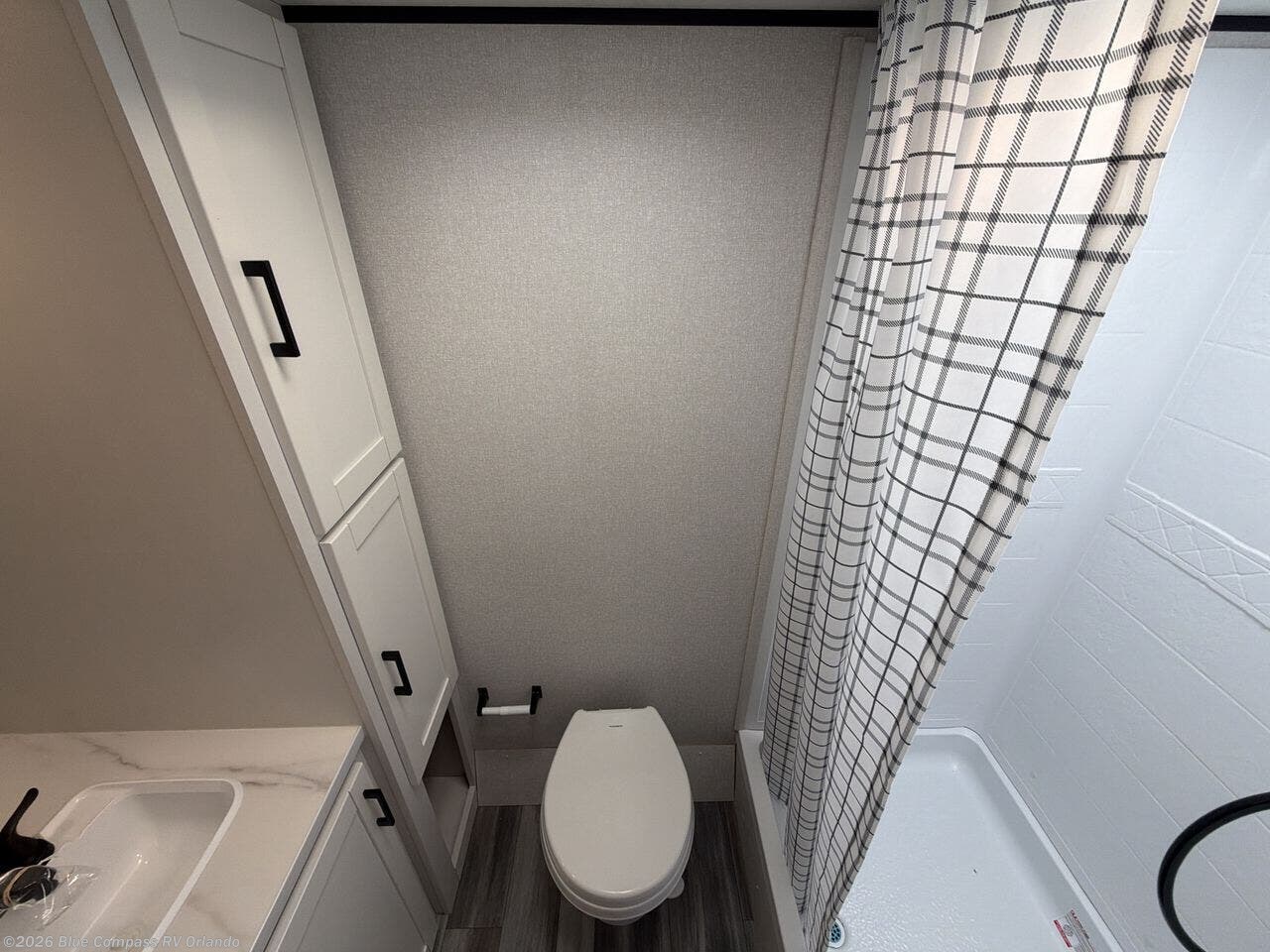 This travel trailer includes everything you need for fun trips at the lake. When you arrive at the campground, you can unload the exterior storage, then put out the 12' power awning with LED lights. There is also an LP Quick Connect if you want to hook up your own grill! The booth dinette inside will provide a place to dine together, and the full rear bath with a tub/shower will make bath time easier than ever for little ones. A front RV queen bed will provide a great night's rest, and the privacy curtain will be appreciated when you're getting dressed in the morning.