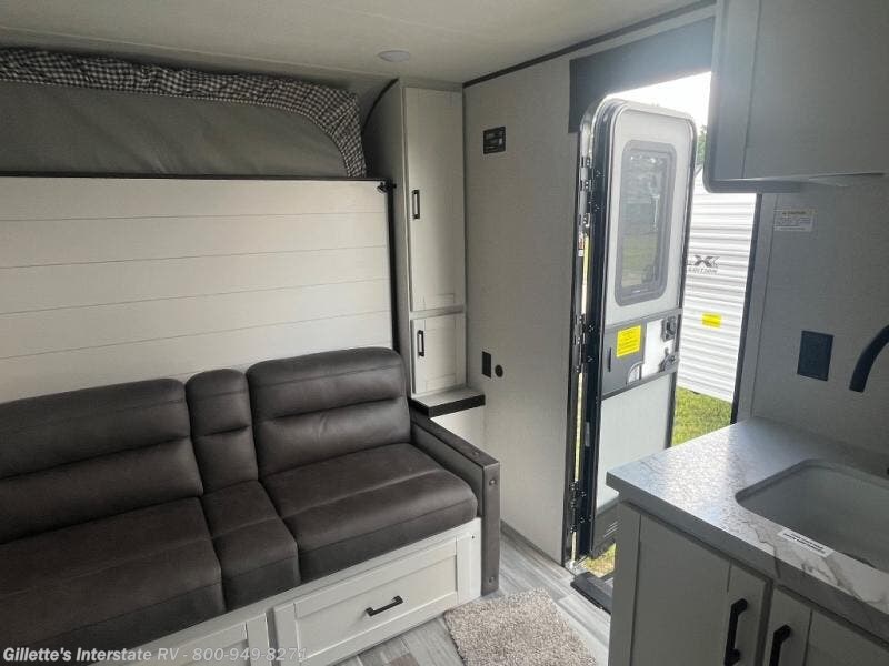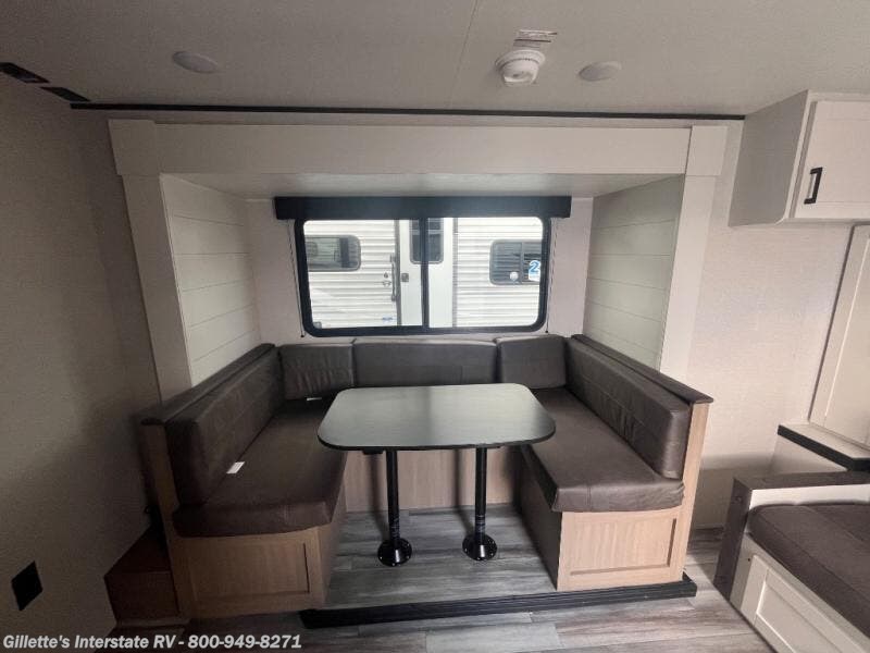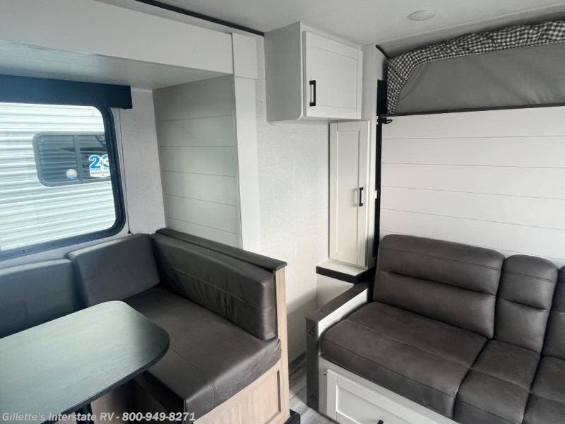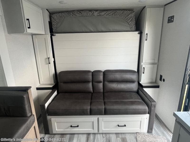 Any time spent in this travel trailer will be time well spent! You can easily sleep eight people each night thanks to the double-size bunks, front Murphy bed, and U-shaped dinette within the slide out. There is a full bath next to the bunks for easy nighttime use, and the linen closet will be perfect for clean towels. A cooktop, microwave oven, and 8 cu. ft. 12V refrigerator will let you cook and store food, and there is an overhead cabinet for spices or snacks!