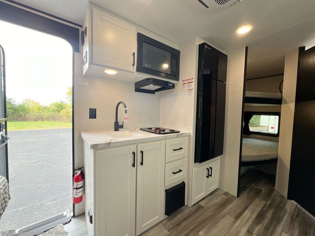 Any time spent in this travel trailer will be time well spent! You can easily sleep eight people each night thanks to the double-size bunks, front Murphy bed, and U-shaped dinette within the slide out. There is a full bath next to the bunks for easy nighttime use, and the linen closet will be perfect for clean towels. A cooktop, microwave oven, and 8 cu. ft. 12V refrigerator will let you cook and store food, and there is an overhead cabinet for spices or snacks!