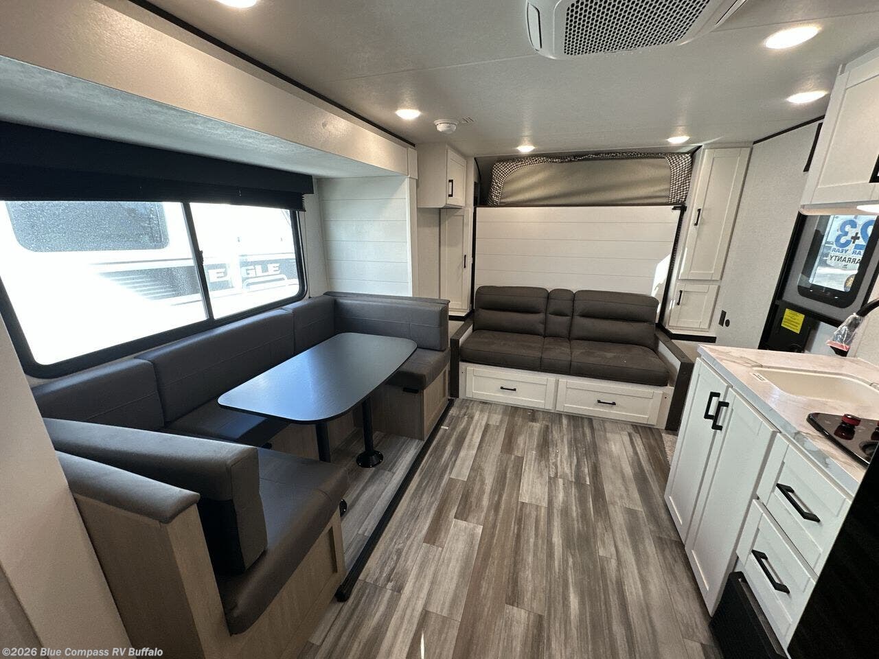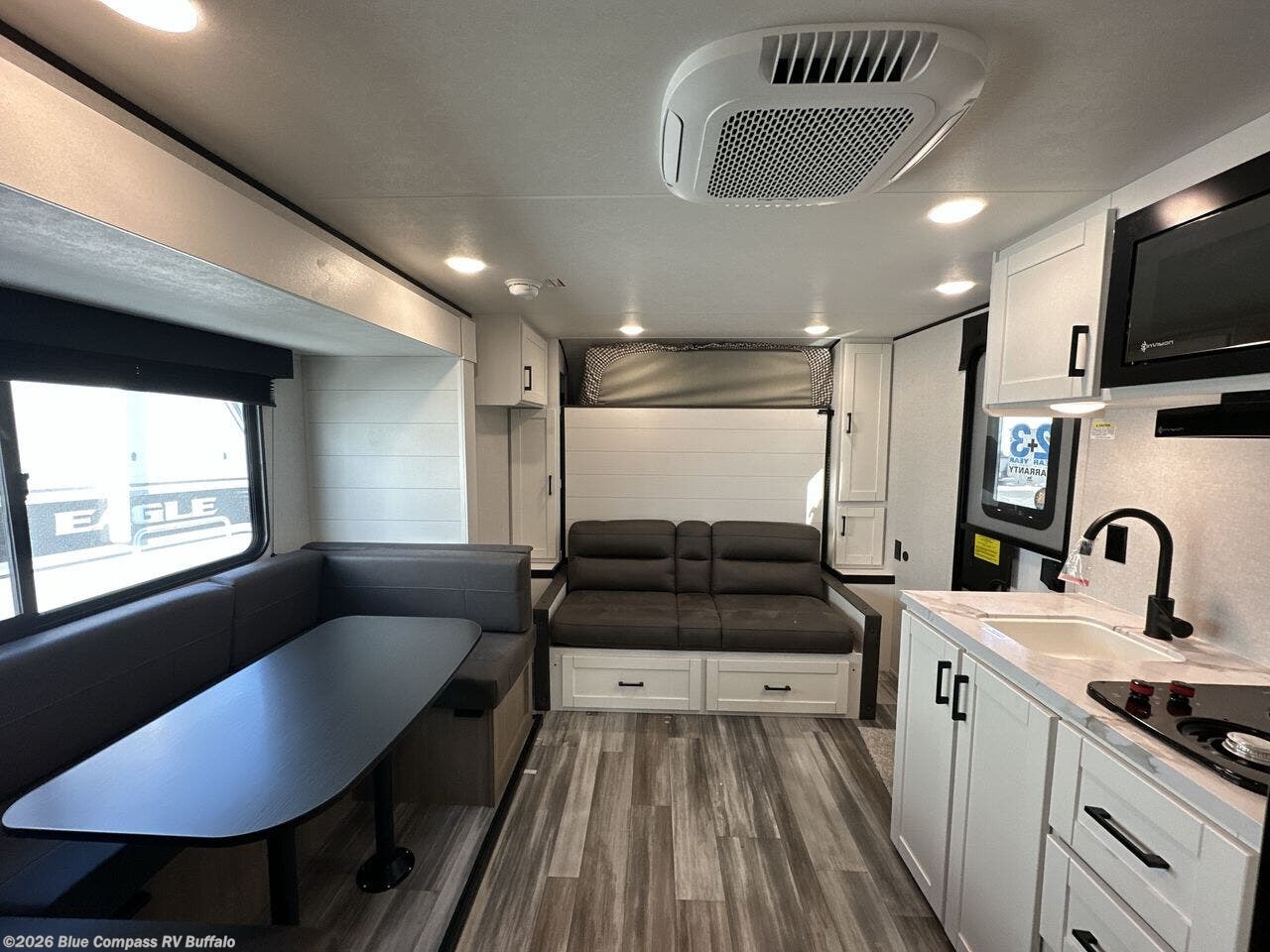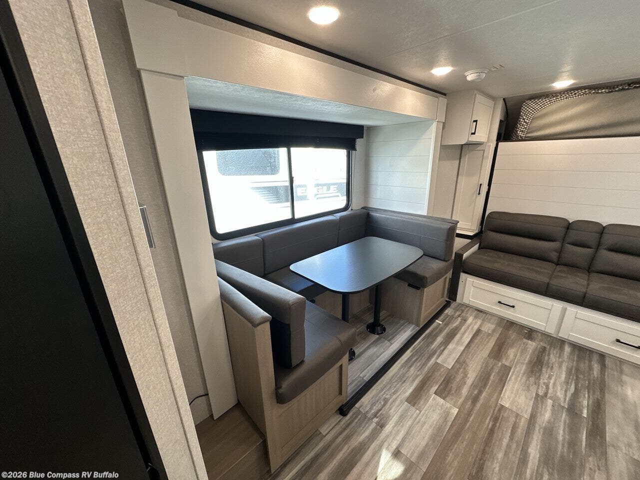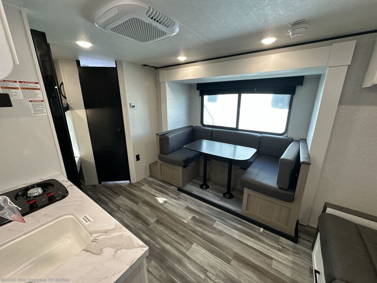 Any time spent in this travel trailer will be time well spent! You can easily sleep eight people each night thanks to the double-size bunks, front Murphy bed, and U-shaped dinette within the slide out. There is a full bath next to the bunks for easy nighttime use, and the linen closet will be perfect for clean towels. A cooktop, microwave oven, and 8 cu. ft. 12V refrigerator will let you cook and store food, and there is an overhead cabinet for spices or snacks!