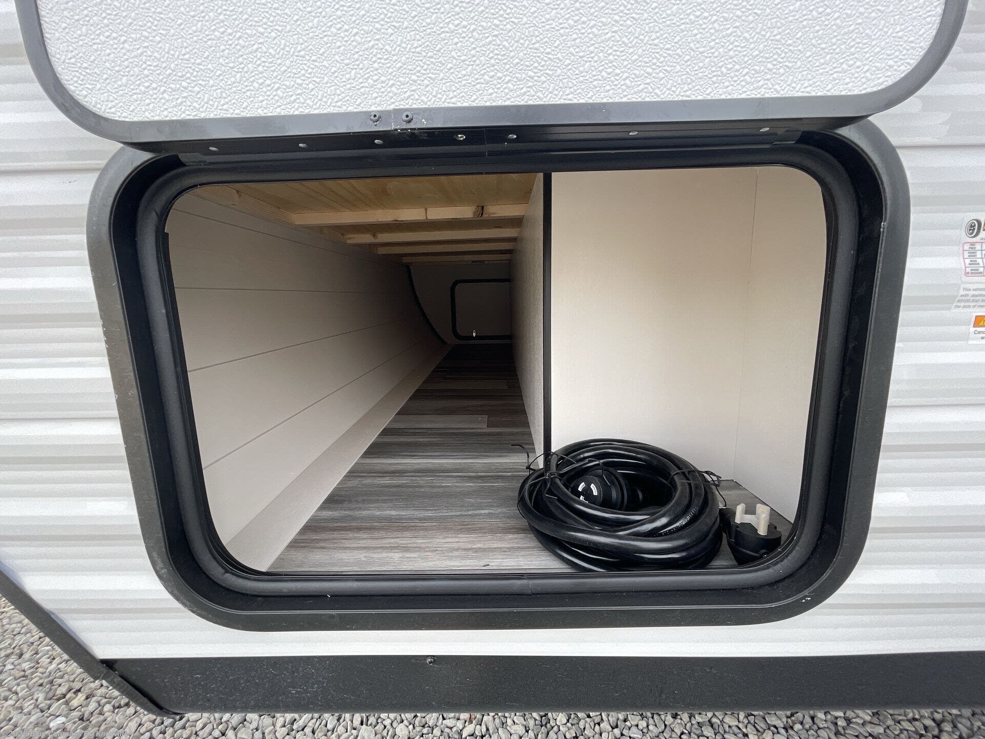 Any time spent in this travel trailer will be time well spent! You can easily sleep eight people each night thanks to the double-size bunks, front Murphy bed, and U-shaped dinette within the slide out. There is a full bath next to the bunks for easy nighttime use, and the linen closet will be perfect for clean towels. A cooktop, microwave oven, and 8 cu. ft. 12V refrigerator will let you cook and store food, and there is an overhead cabinet for spices or snacks!