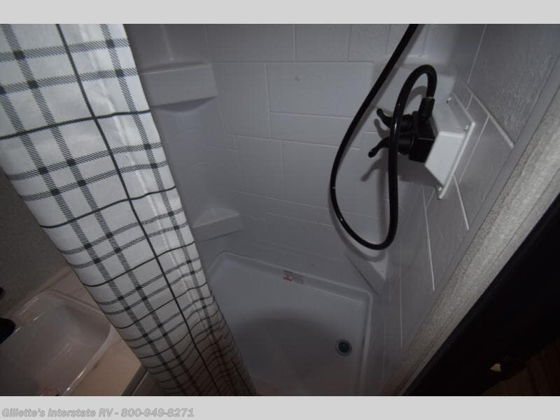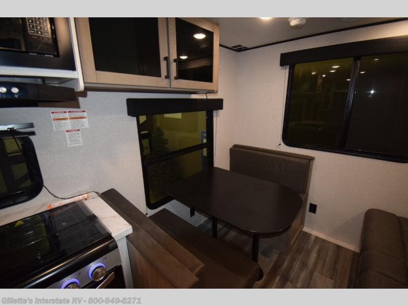 Camping in the woods is just what the doctor ordered and this trailer will provide all the interior comforts you need! There is a three burner cooktop and a microwave oven to prepare meals each day, plus an 8 cu. ft. 12V refrigerator for cold items. After your meal is made, you can dine at the booth dinette or relax on the jack-knife sofa, and these areas can become sleeping space for two to three guests at night. The full bath with a shower means you won't have to use the camp's facilities and the 16' power awning will provide protection from the sun as you visit with other campers!
