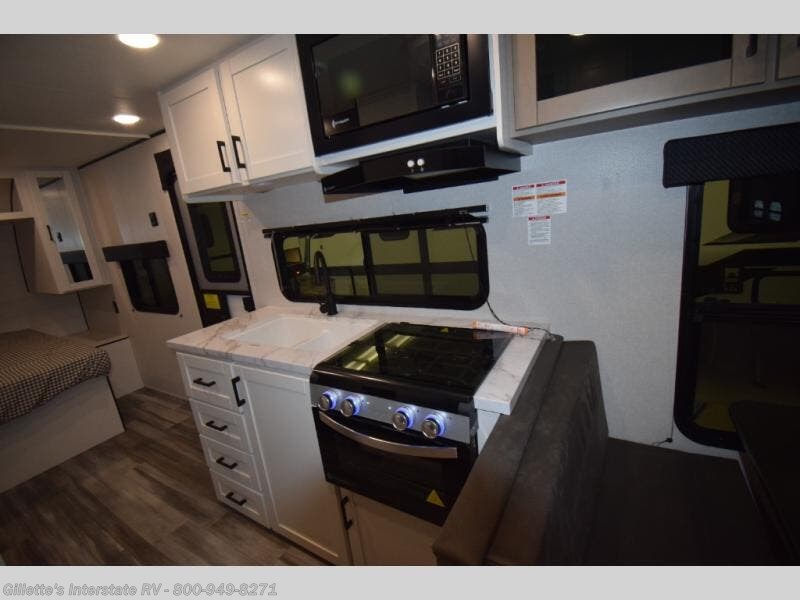 Camping in the woods is just what the doctor ordered and this trailer will provide all the interior comforts you need! There is a three burner cooktop and a microwave oven to prepare meals each day, plus an 8 cu. ft. 12V refrigerator for cold items. After your meal is made, you can dine at the booth dinette or relax on the jack-knife sofa, and these areas can become sleeping space for two to three guests at night. The full bath with a shower means you won't have to use the camp's facilities and the 16' power awning will provide protection from the sun as you visit with other campers!