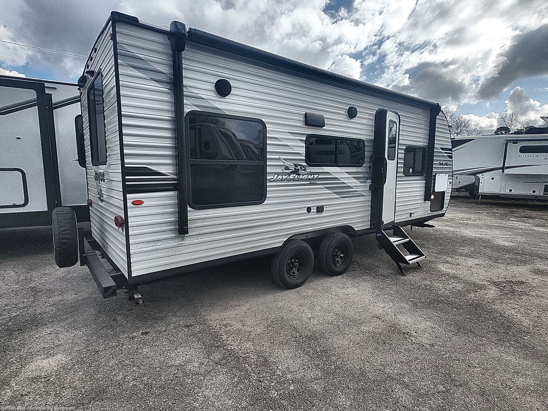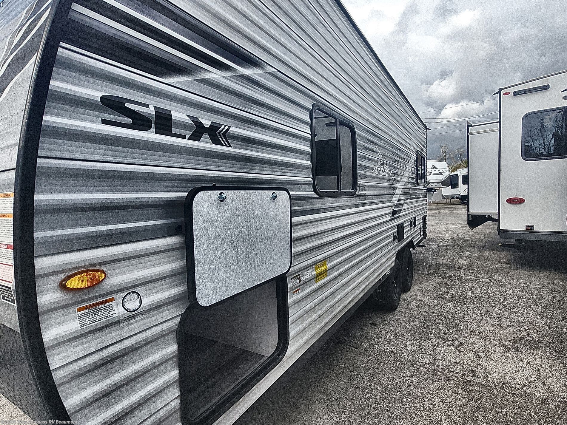 The Jayco Jay Flight SLX travel trailer is quite easy to own because it is lightweight for an easier towing experience. Built on a fully integrated A-frame with galvanized-steel, impact-resistant wheel wells, the Jay Flight SLX has quality at its very foundation. That quality continues on to the electric self-adjusting brakes, easy-lube hubs, Magnum Truss roof system, and LP quick connect. Some of what the mandatory Customer Value Package includes is backup camera prep, Keyed-Alike entry and baggage doors, and an on-demand tankless water heater.