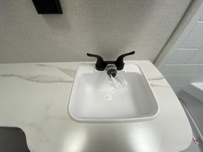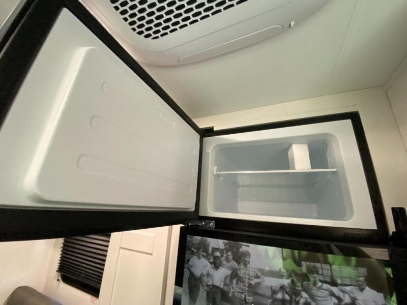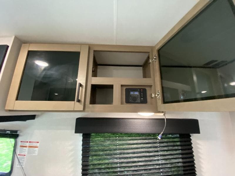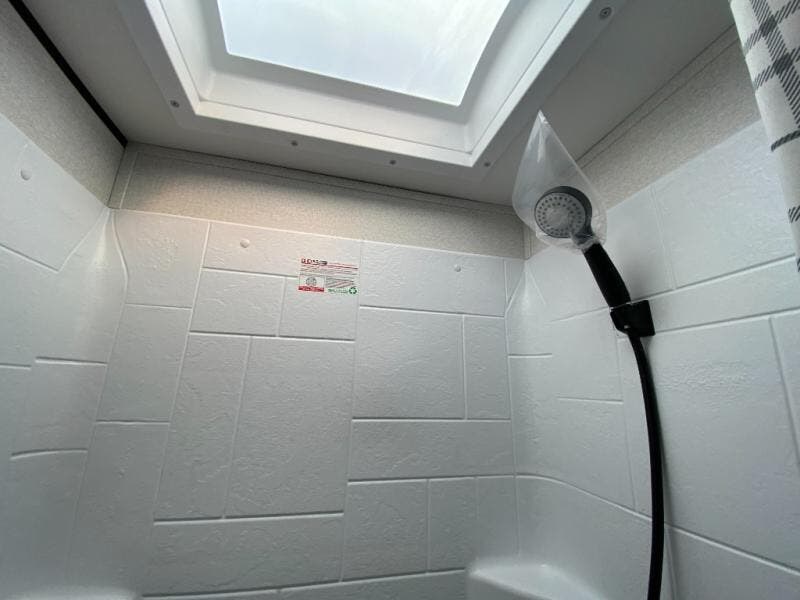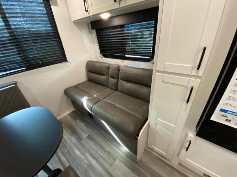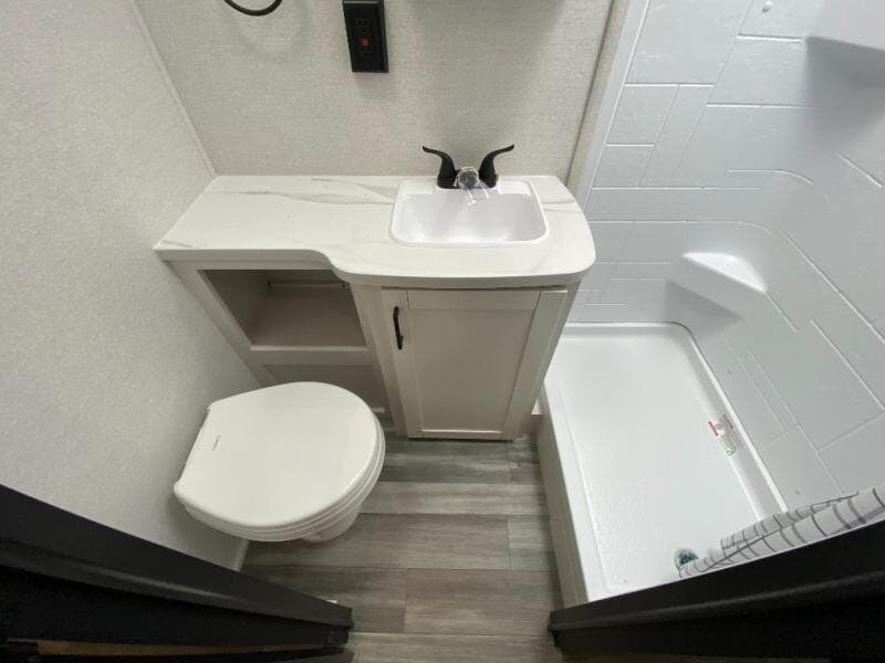 The kitchen includes a three-burner cooktop, microwave oven, and an 8 cu. ft. 12V refrigerator, giving you everything you need to prepare meals at the campsite. After a day outdoors, the full bathroom with shower allows you to freshen up without using campground facilities.