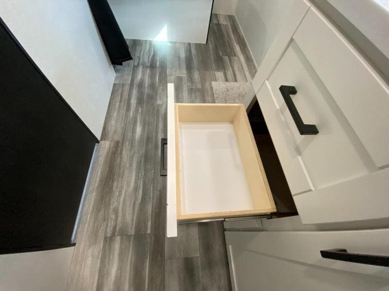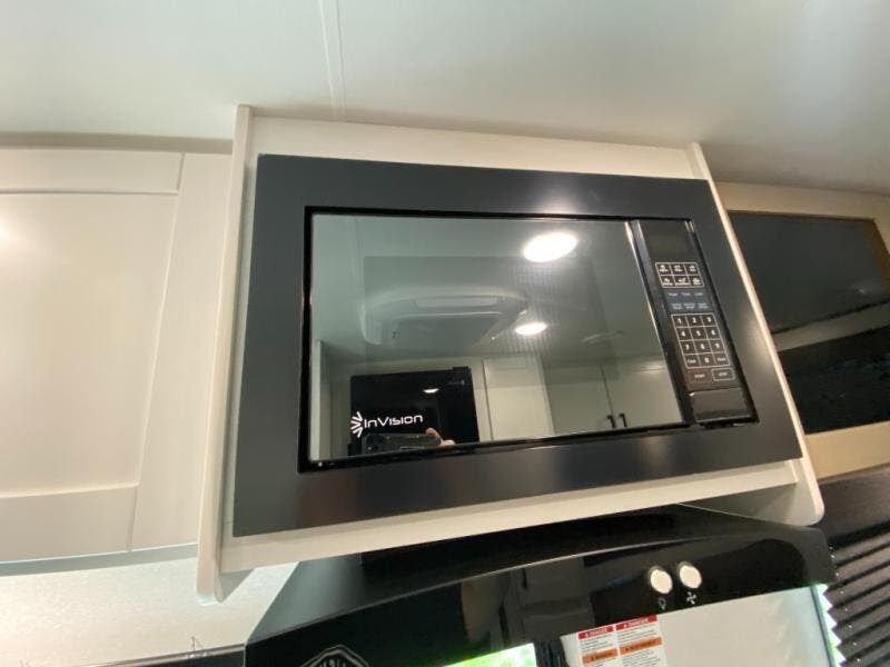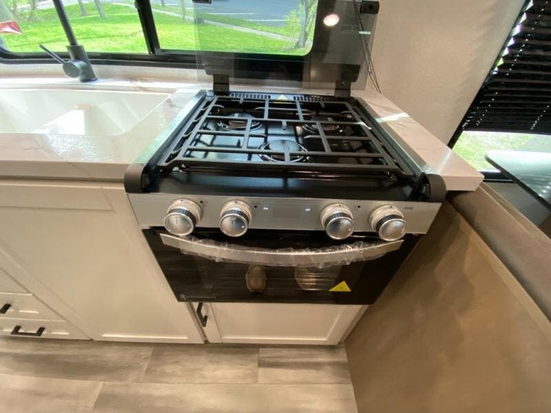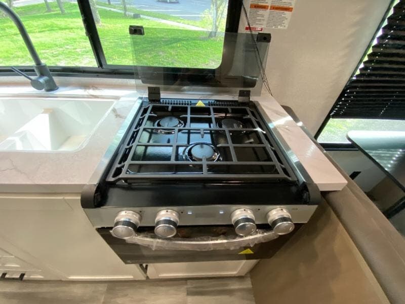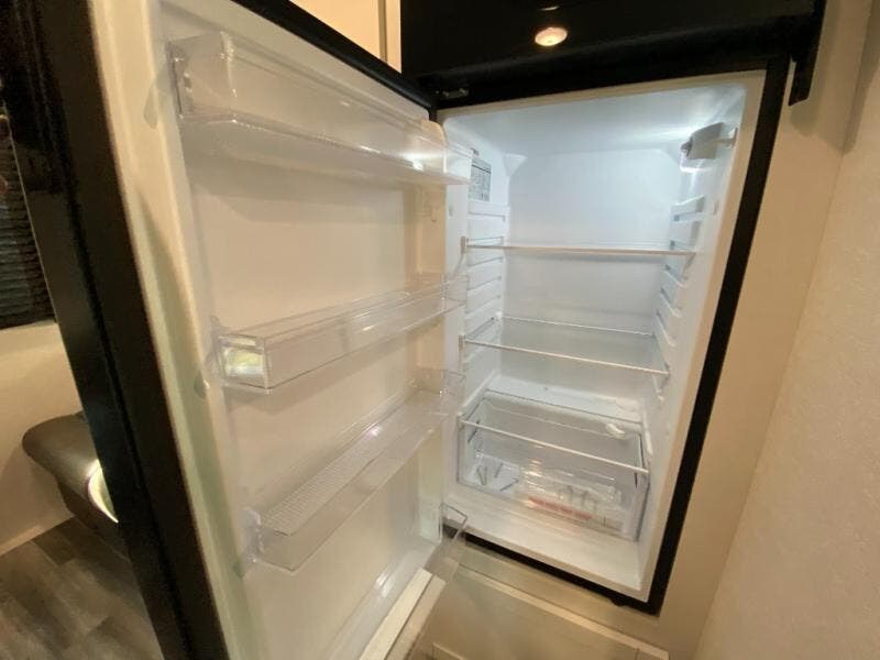 The kitchen includes a three-burner cooktop, microwave oven, and an 8 cu. ft. 12V refrigerator, giving you everything you need to prepare meals at the campsite. After a day outdoors, the full bathroom with shower allows you to freshen up without using campground facilities.