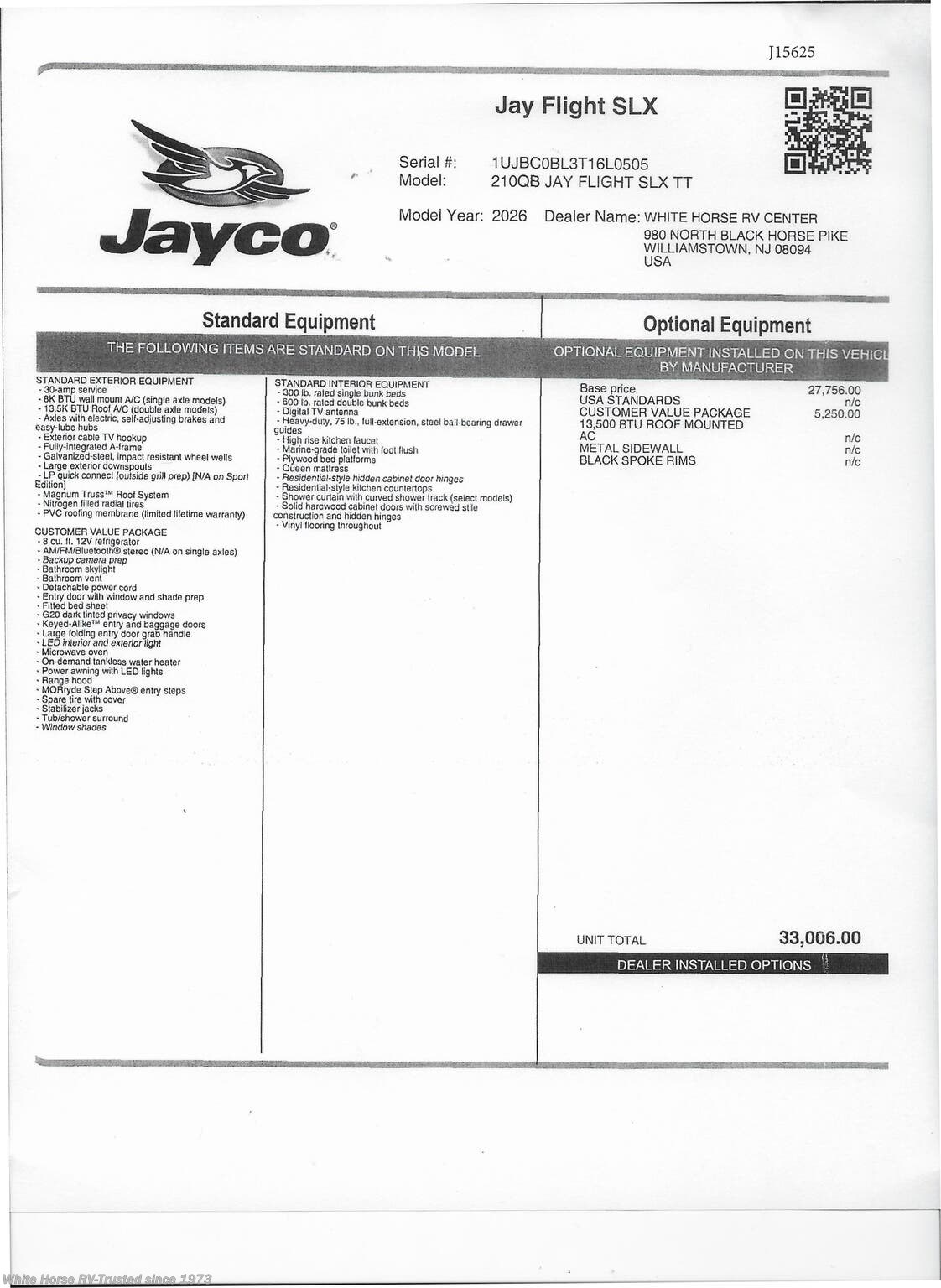 Solid Step ® Entry Steps, Spare Tire with Cover, Stabilizer Jacks, Tub/Shower Surround , Window Shades,...all backed by Jayco’s 2+3-year warranty! MSRP $33,006.00.