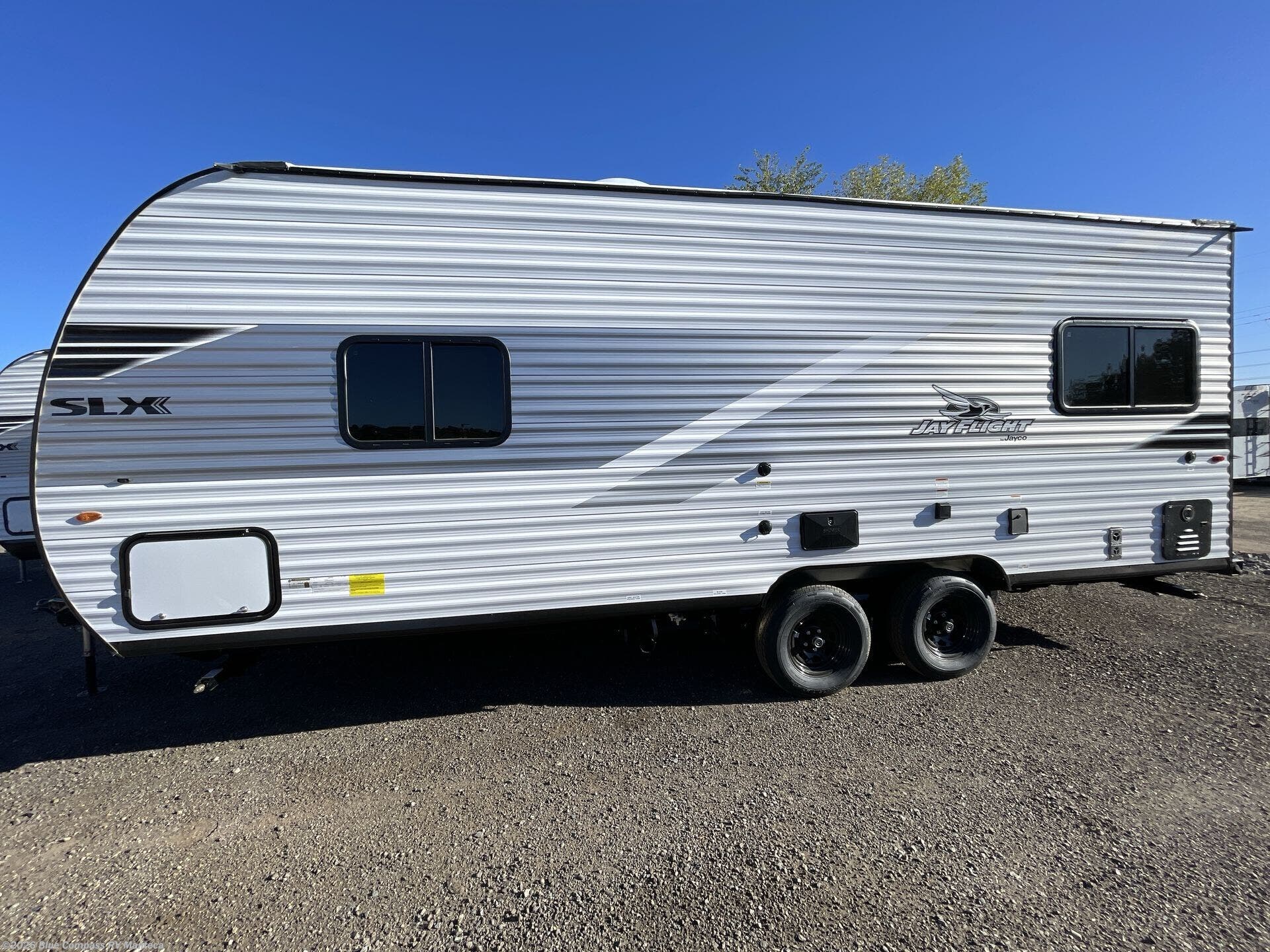 The Jayco Jay Flight SLX travel trailer is quite easy to own because it is lightweight for an easier towing experience. Built on a fully integrated A-frame with galvanized-steel, impact-resistant wheel wells, the Jay Flight SLX has quality at its very foundation. That quality continues on to the electric self-adjusting brakes, easy-lube hubs, Magnum Truss roof system, and LP quick connect. Some of what the mandatory Customer Value Package includes is backup camera prep, Keyed-Alike entry and baggage doors, and an on-demand tankless water heater.