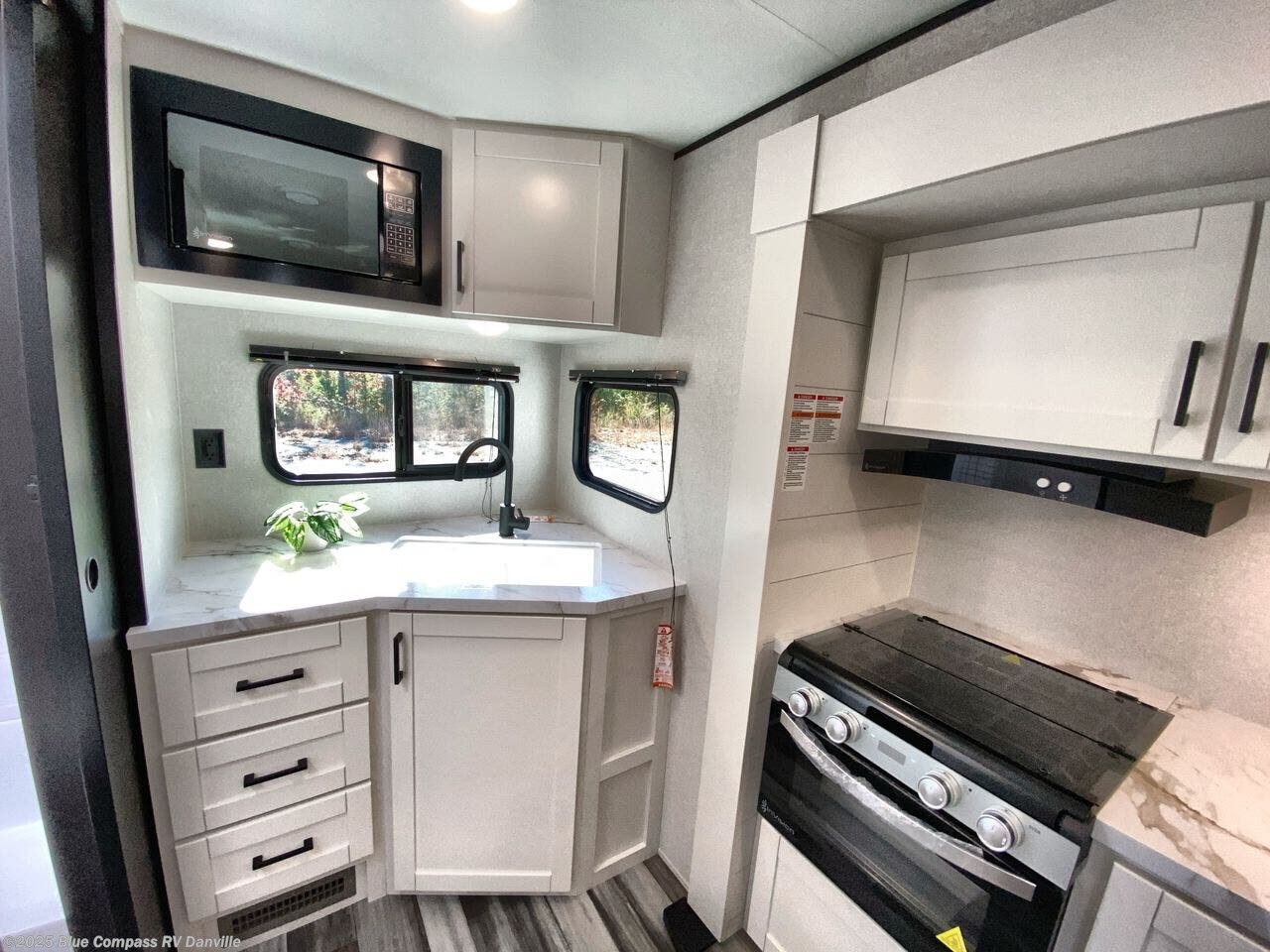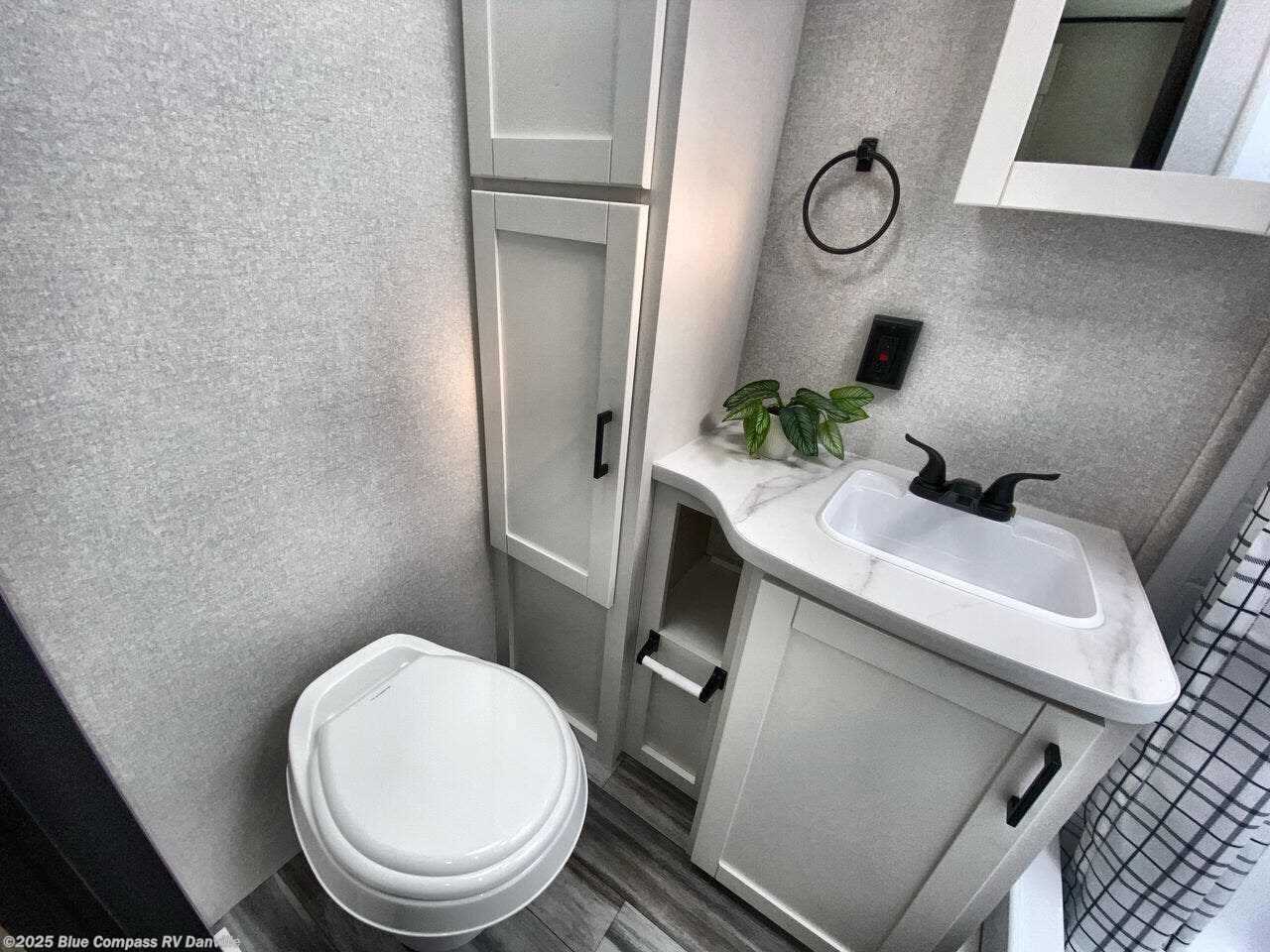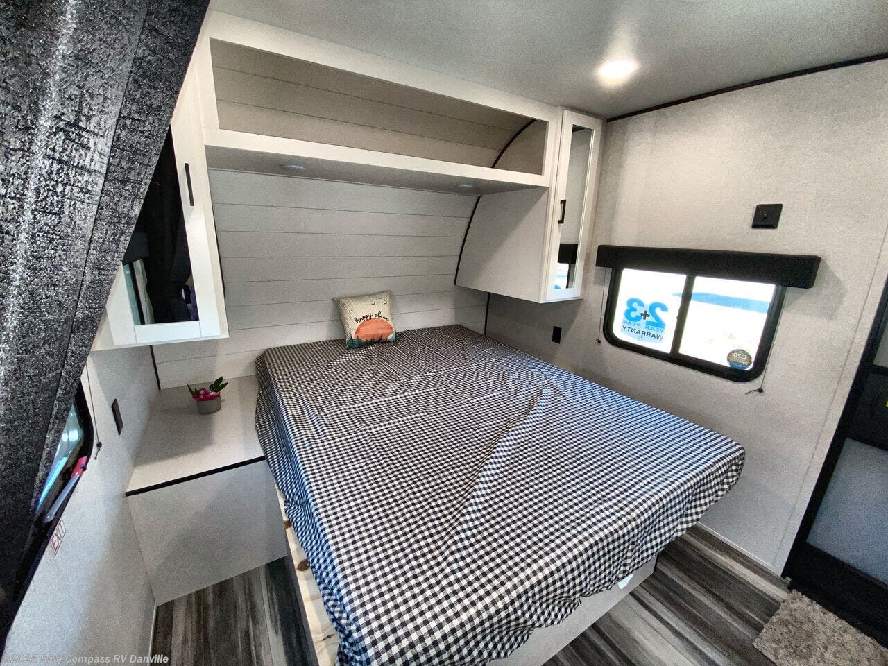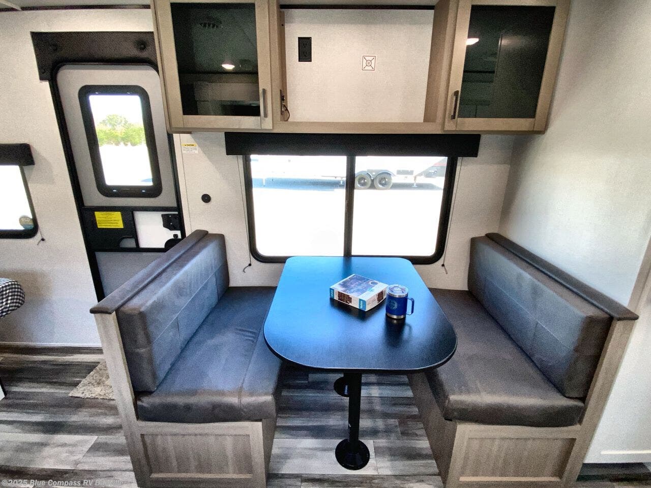 You will have a comfortable camping trip in this travel trailer! It offers full kitchen amenities including a pantry for snacks and such, plus a full rear corner bathroom for privacy and includes a shower. When you need a break, the semi-private bedroom up front offers a queen bed, dual wardrobes and a curtain to close, and the booth dinette can transform into a sleeping space as well. There is a 18' power awning with LED lights for you to enjoy this outdoor space into the night, plus exterior storage for your outdoor games and gear.