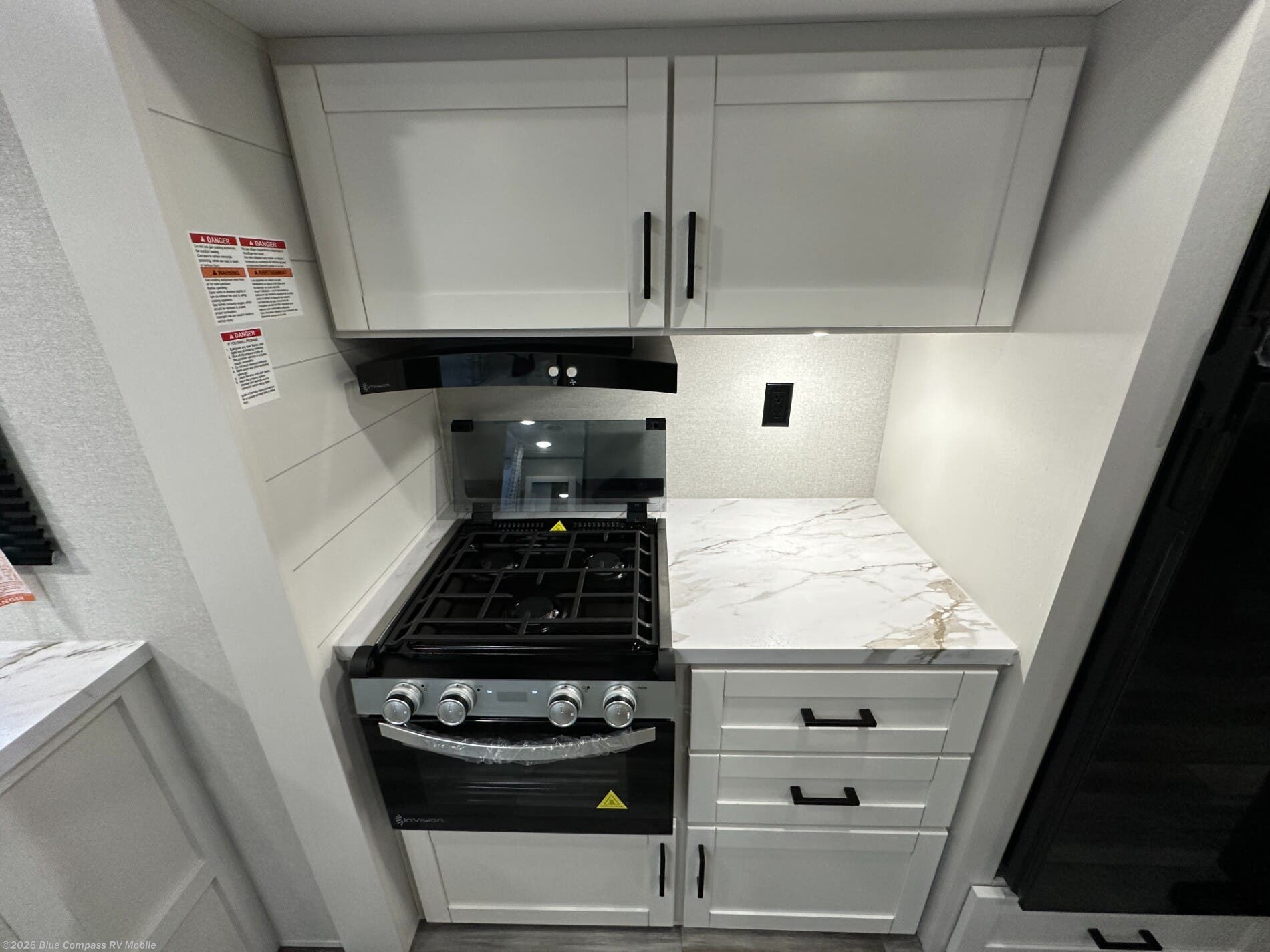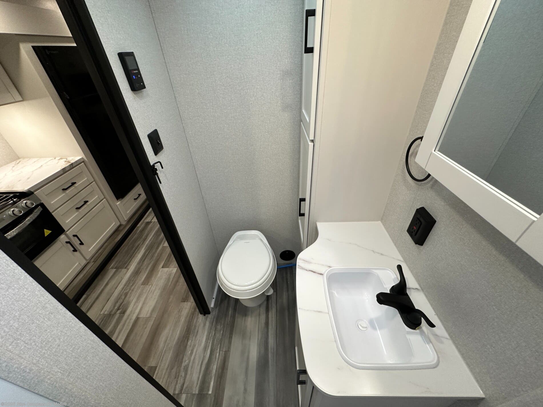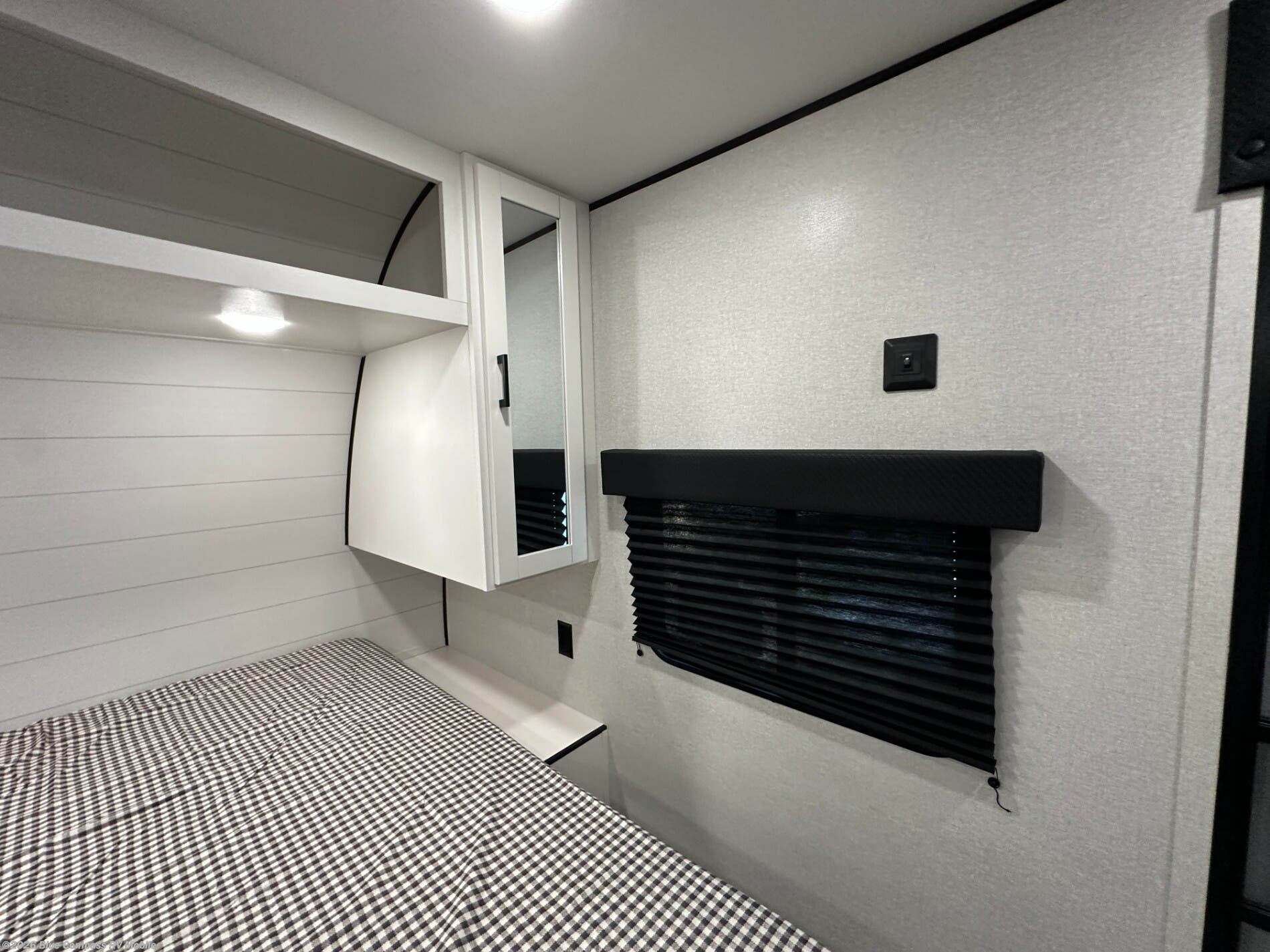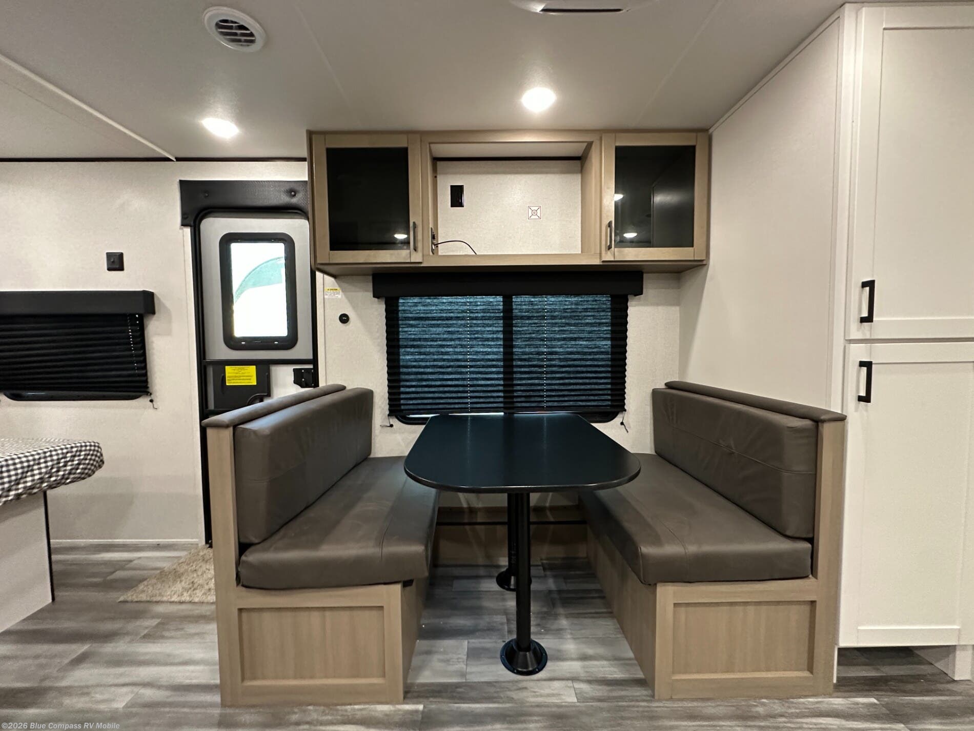 You will have a comfortable camping trip in this travel trailer! It offers full kitchen amenities including a pantry for snacks and such, plus a full rear corner bathroom for privacy and includes a shower. When you need a break, the semi-private bedroom up front offers a queen bed, dual wardrobes and a curtain to close, and the booth dinette can transform into a sleeping space as well. There is a 18' power awning with LED lights for you to enjoy this outdoor space into the night, plus exterior storage for your outdoor games and gear.