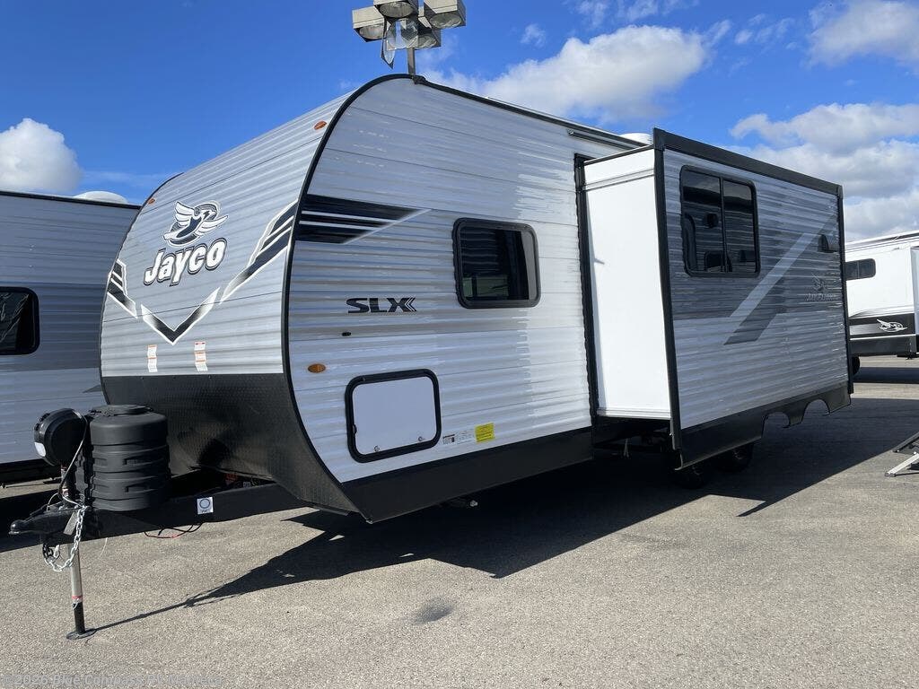 The Jayco Jay Flight SLX travel trailer is quite easy to own because it is lightweight for an easier towing experience. Built on a fully integrated A-frame with galvanized-steel, impact-resistant wheel wells, the Jay Flight SLX has quality at its very foundation. That quality continues on to the electric self-adjusting brakes, easy-lube hubs, Magnum Truss roof system, and LP quick connect. Some of what the mandatory Customer Value Package includes is backup camera prep, Keyed-Alike entry and baggage doors, marine grade exterior speakers, and an on-demand tankless water heater.