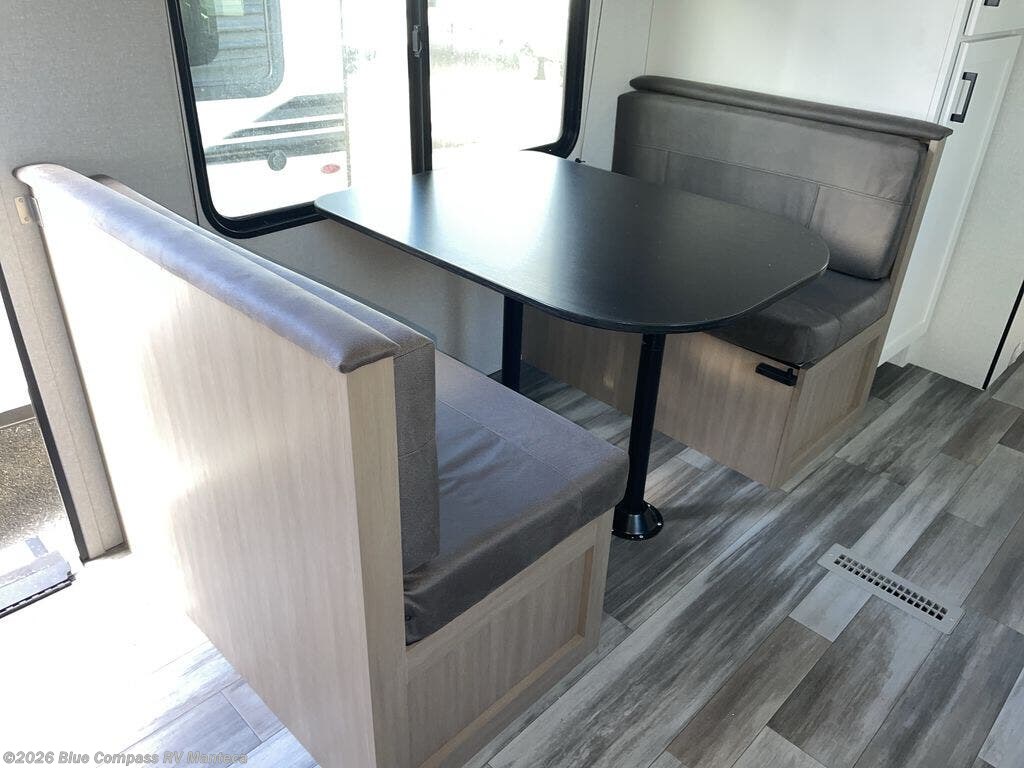 You will have a comfortable camping trip in this travel trailer! It offers full kitchen amenities including a pantry for snacks and such, plus a full rear corner bathroom for privacy and includes a shower. When you need a break, the semi-private bedroom up front offers a queen bed, dual wardrobes and a curtain to close, and the booth dinette can transform into a sleeping space as well. There is a 18' power awning with LED lights for you to enjoy this outdoor space into the night, plus exterior storage for your outdoor games and gear.