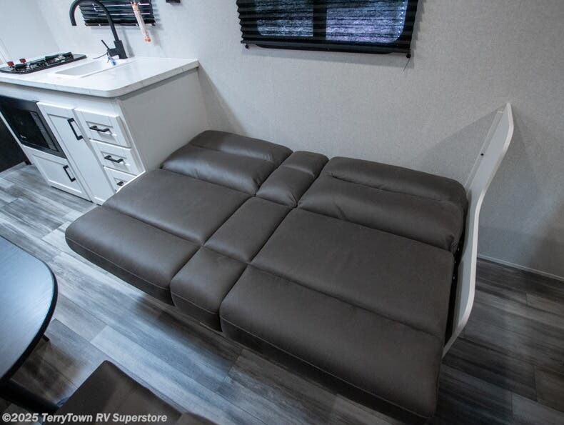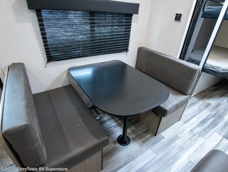 You can comfortably sleep eight to ten people in this trailer thanks to the double-size bunks, the 60" x 80" queen bed in the front bedroom, plus the booth dinette and jack-knife sofa in the main living area! The chef of your crew will have a two burner cooktop and microwave oven to prepare meals, and everyone can store their favorite drinks in the 12V refrigerator. The bathroom includes a 40" shower and a toilet, with the sink just outside of this room so others can brush their teeth if one is taking a shower before bed. The outside storage will let you bring along fishing poles and the 12' power awning will create a nice place to gather in the evenings!