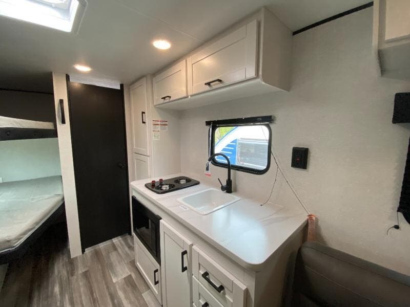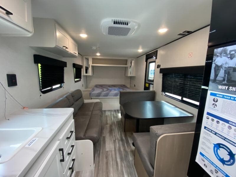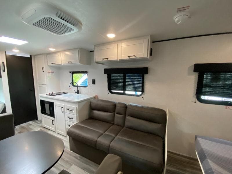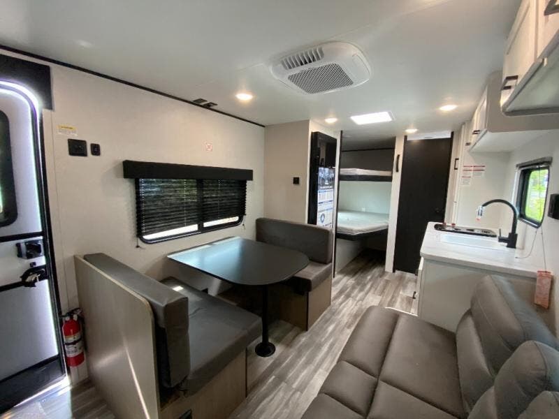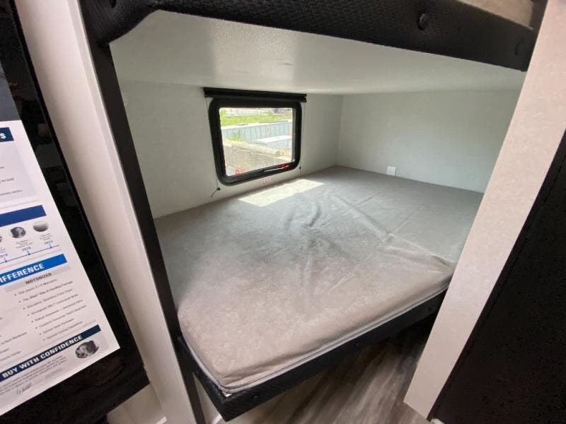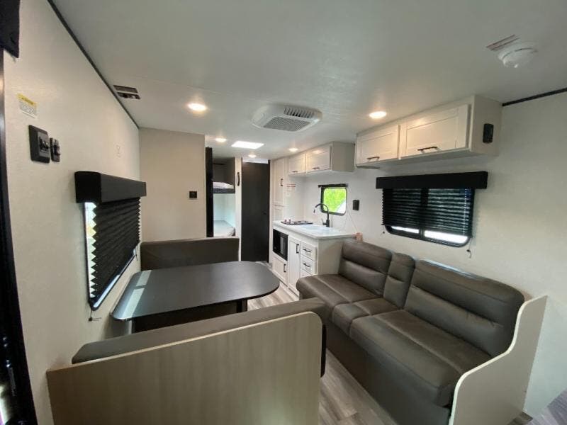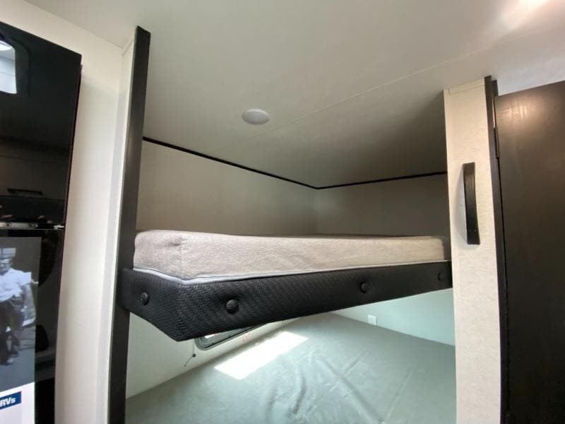 You can comfortably sleep eight to ten people in this trailer thanks to the double-size bunks, the 60" x 80" queen bed in the front bedroom, plus the booth dinette and jack-knife sofa in the main living area! The chef of your crew will have a two burner cooktop and microwave oven to prepare meals, and everyone can store their favorite drinks in the 12V refrigerator. The bathroom includes a 40" shower and a toilet, with the sink just outside of this room so others can brush their teeth if one is taking a shower before bed. The outside storage will let you bring along fishing poles and the 12' power awning will create a nice place to gather in the evenings!