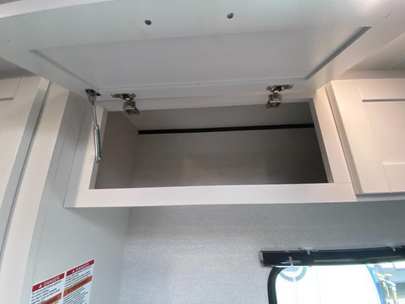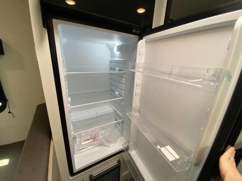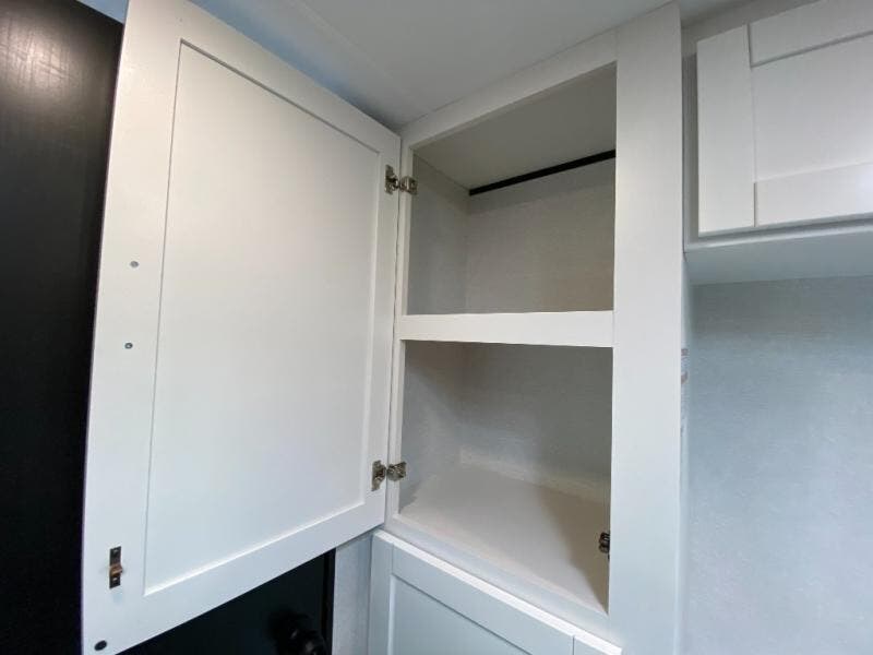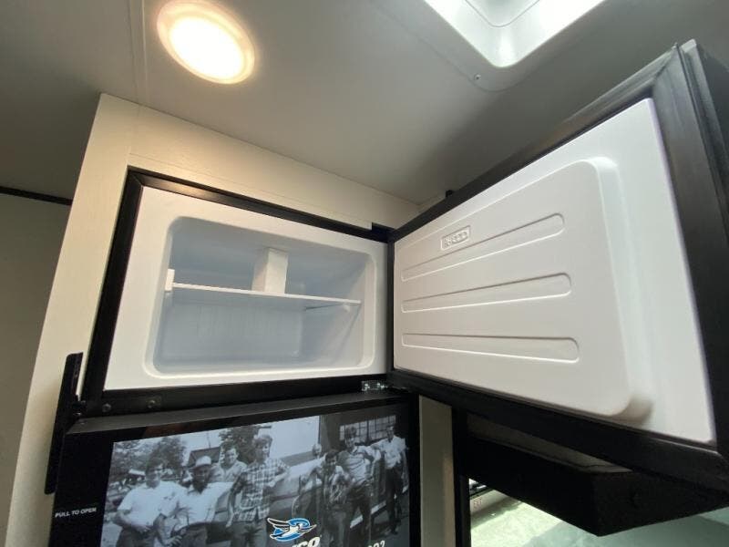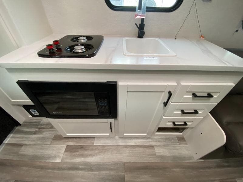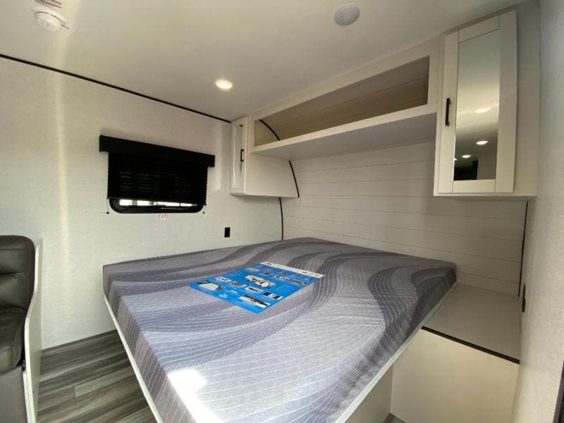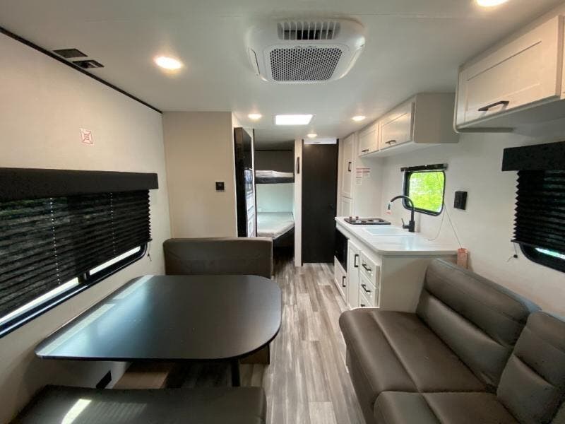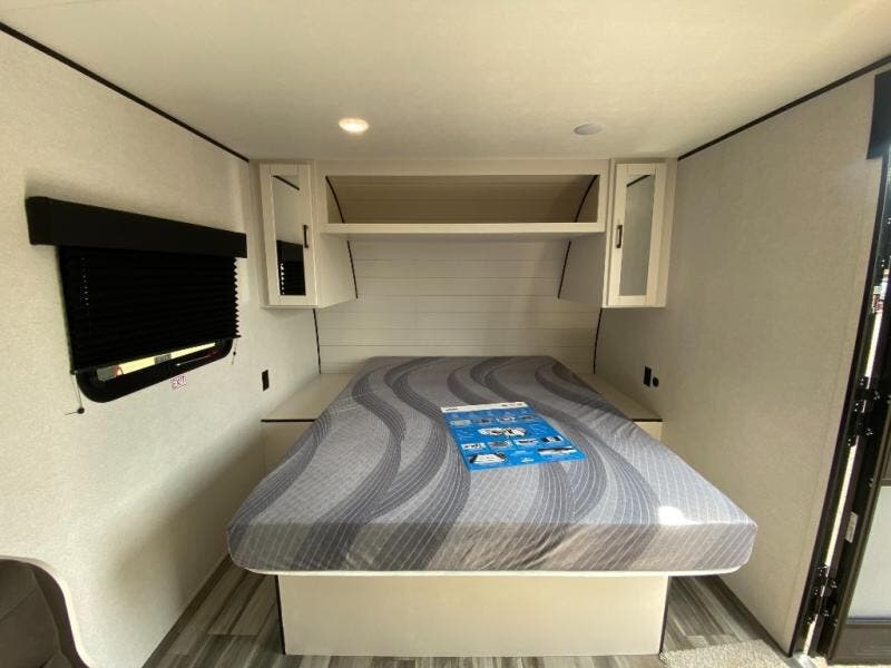 You can comfortably sleep eight to ten people in this trailer thanks to the double-size bunks, the 60" x 80" queen bed in the front bedroom, plus the booth dinette and jack-knife sofa in the main living area! The chef of your crew will have a two burner cooktop and microwave oven to prepare meals, and everyone can store their favorite drinks in the 12V refrigerator. The bathroom includes a 40" shower and a toilet, with the sink just outside of this room so others can brush their teeth if one is taking a shower before bed. The outside storage will let you bring along fishing poles and the 12' power awning will create a nice place to gather in the evenings!