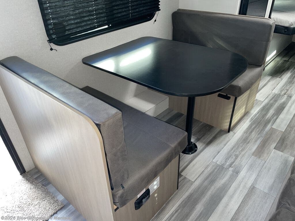 You can comfortably sleep eight to ten people in this trailer thanks to the double-size bunks, the 60" x 80" queen bed in the front bedroom, plus the booth dinette and jack-knife sofa in the main living area! The chef of your crew will have a two burner cooktop and microwave oven to prepare meals, and everyone can store their favorite drinks in the 12V refrigerator. The bathroom includes a 40" shower and a toilet, with the sink just outside of this room so others can brush their teeth if one is taking a shower before bed. The outside storage will let you bring along fishing poles and the 12' power awning will create a nice place to gather in the evenings!
