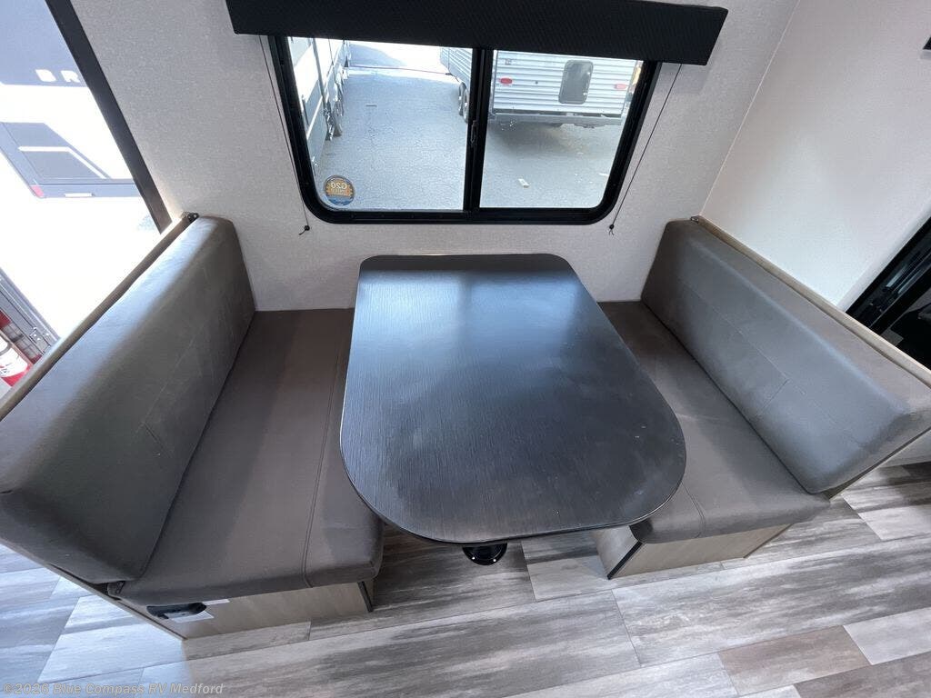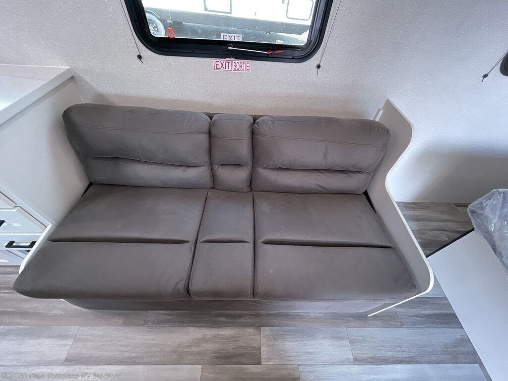 You can comfortably sleep eight to ten people in this trailer thanks to the double-size bunks, the 60" x 80" queen bed in the front bedroom, plus the booth dinette and jack-knife sofa in the main living area! The chef of your crew will have a two burner cooktop and microwave oven to prepare meals, and everyone can store their favorite drinks in the 12V refrigerator. The bathroom includes a 40" shower and a toilet, with the sink just outside of this room so others can brush their teeth if one is taking a shower before bed. The outside storage will let you bring along fishing poles and the 12' power awning will create a nice place to gather in the evenings!