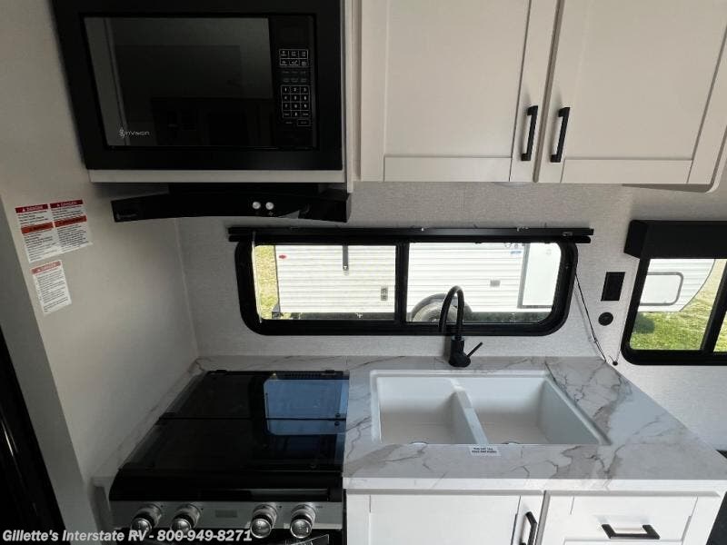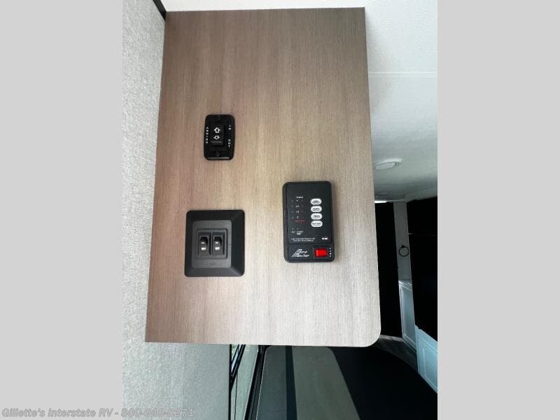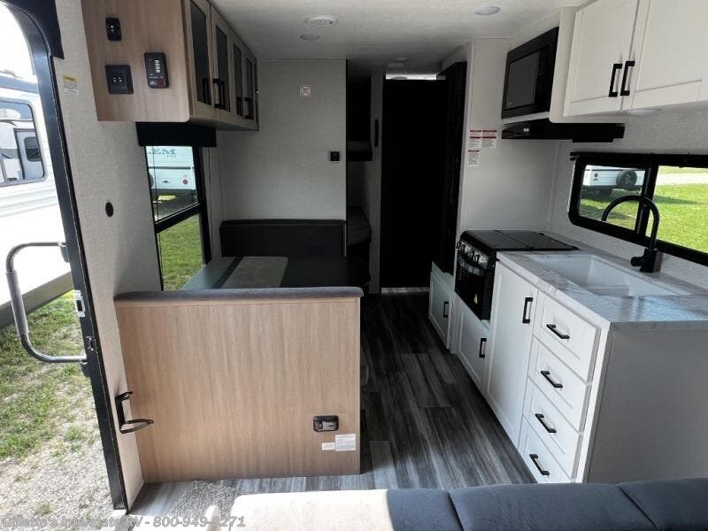 You can comfortably sleep eight to ten people in this trailer thanks to the double-size bunks, the RV queen bed in the front bedroom, plus the booth dinette and jack-knife sofa in the main living area! The chef of your crew will have a three burner cooktop and microwave oven to prepare meals, and everyone can store their favorite drinks in the 8 cu. ft. 12V refrigerator. The bathroom includes a tub/shower and a toilet, with the sink just outside of this room so others can brush their teeth if one is taking a shower before bed. The outside storage will let you bring along fishing poles and the 16' power awning with LED lights will create a nice place to gather in the evenings!