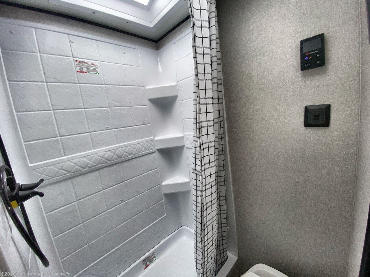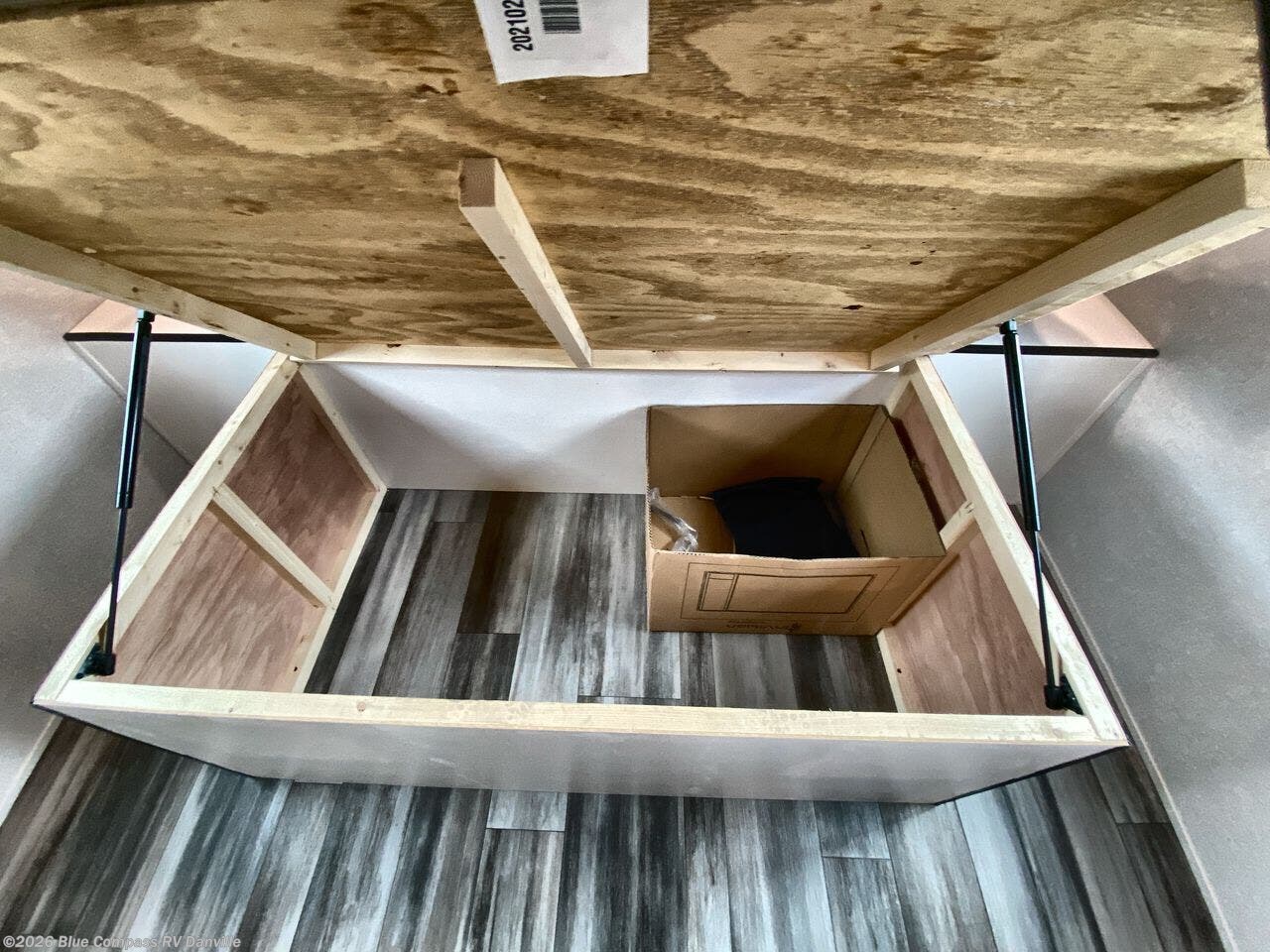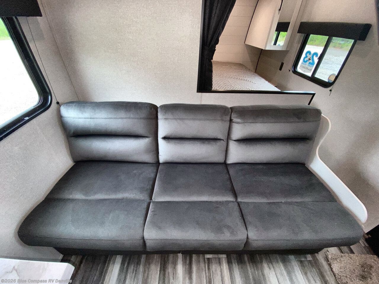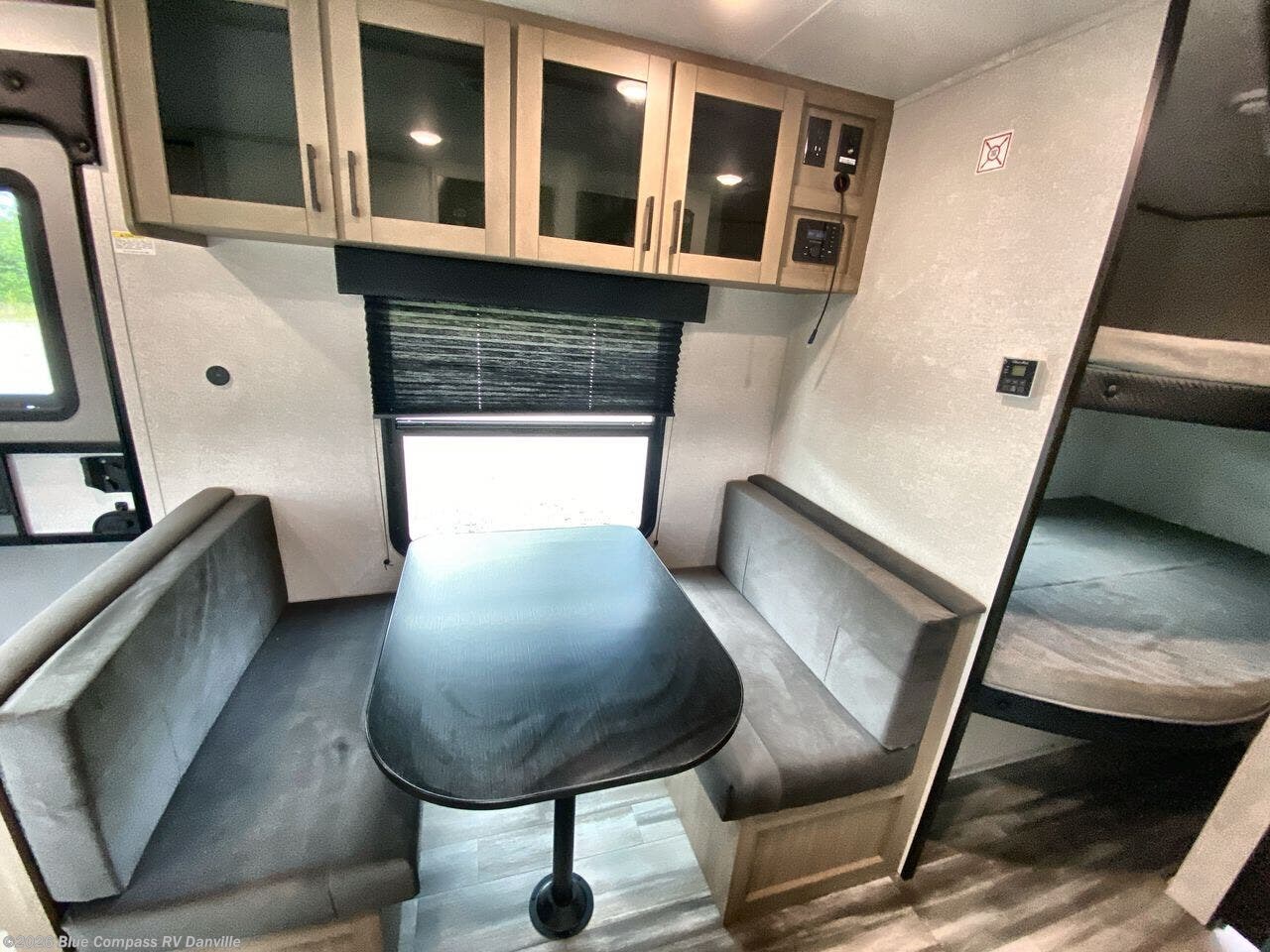 You can comfortably sleep eight to ten people in this trailer thanks to the double-size bunks, the RV queen bed in the front bedroom, plus the booth dinette and jack-knife sofa in the main living area! The chef of your crew will have a three burner cooktop and microwave oven to prepare meals, and everyone can store their favorite drinks in the 8 cu. ft. 12V refrigerator. The bathroom includes a tub/shower and a toilet, with the sink just outside of this room so others can brush their teeth if one is taking a shower before bed. The outside storage will let you bring along fishing poles and the 16' power awning with LED lights will create a nice place to gather in the evenings!