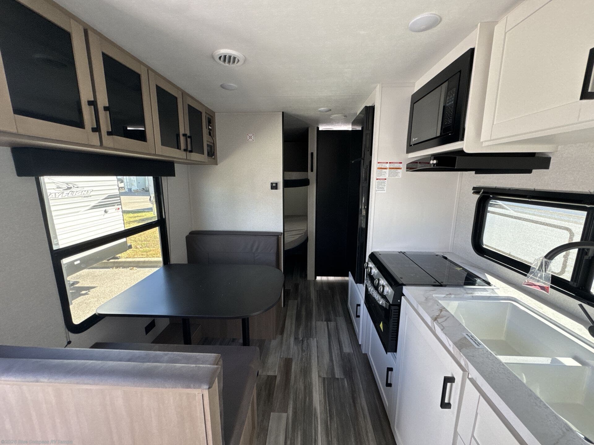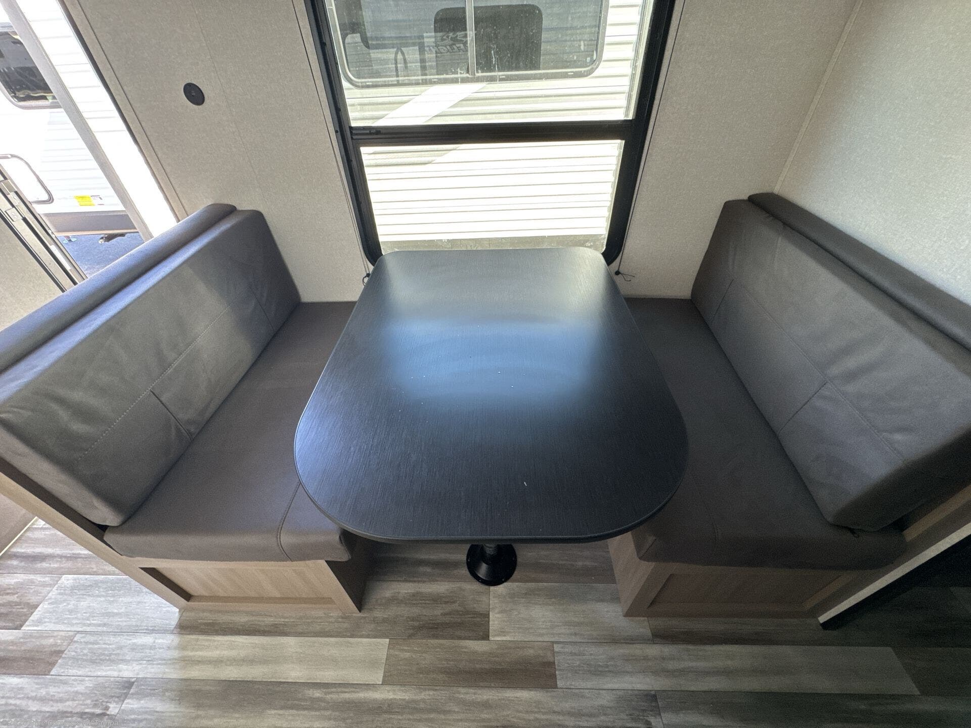 You can comfortably sleep eight to ten people in this trailer thanks to the double-size bunks, the RV queen bed in the front bedroom, plus the booth dinette and jack-knife sofa in the main living area! The chef of your crew will have a three burner cooktop and microwave oven to prepare meals, and everyone can store their favorite drinks in the 8 cu. ft. 12V refrigerator. The bathroom includes a shower and a toilet, with the sink just outside of this room so others can brush their teeth if one is taking a shower before bed. The outside storage will let you bring along fishing poles and the 16' power awning with LED lights will create a nice place to gather in the evenings!
