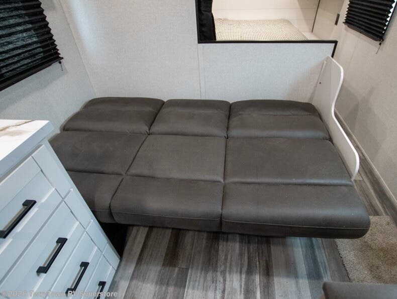 You can comfortably sleep eight to ten people in this trailer thanks to the double-size bunks, the RV queen bed in the front bedroom, plus the booth dinette and jack-knife sofa in the main living area! The chef of your crew will have a three burner cooktop and microwave oven to prepare meals, and everyone can store their favorite drinks in the 8 cu. ft. 12V refrigerator. The bathroom includes a shower and a toilet, with the sink just outside of this room so others can brush their teeth if one is taking a shower before bed. The outside storage will let you bring along fishing poles and the 16' power awning with LED lights will create a nice place to gather in the evenings!