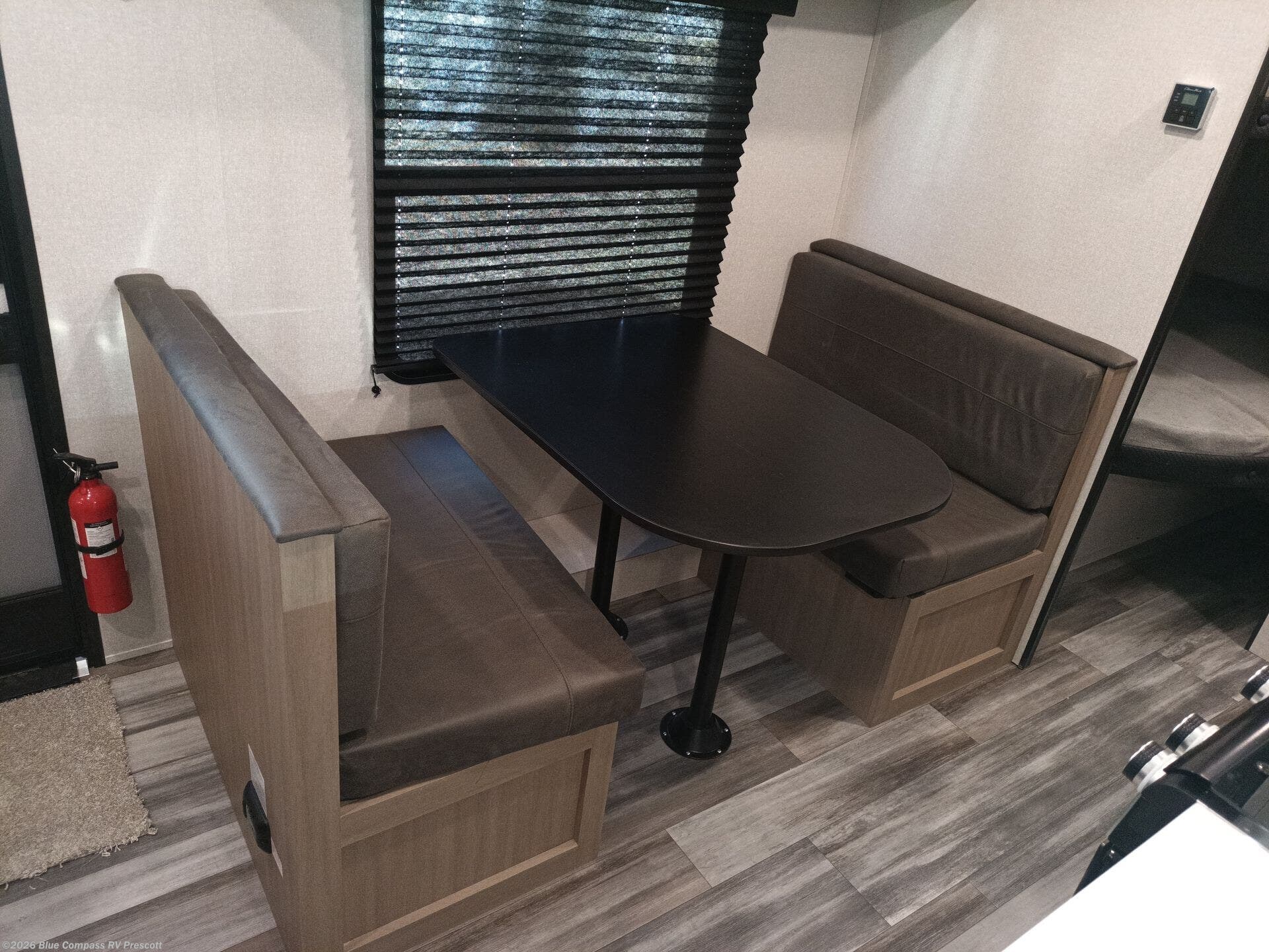 You can comfortably sleep up to eight people in this trailer thanks to the double-size bunks, the RV queen bed in the front bedroom, plus the booth dinette and jack-knife sofa in the main living area! The chef of your crew will have a three burner cooktop and microwave oven to prepare meals, and everyone can store their favorite drinks in the 8 cu. ft. 12V refrigerator. The bathroom includes a shower and a toilet, with the sink just outside of this room so others can brush their teeth if one is taking a shower before bed. The outside storage will let you bring along fishing poles and the 16' power awning with LED lights will create a nice place to gather in the evenings!
