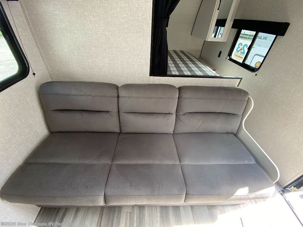 You can comfortably sleep up to eight people in this trailer thanks to the double-size bunks, the RV queen bed in the front bedroom, plus the booth dinette and jack-knife sofa in the main living area! The chef of your crew will have a three burner cooktop and microwave oven to prepare meals, and everyone can store their favorite drinks in the 8 cu. ft. 12V refrigerator. The bathroom includes a shower and a toilet, with the sink just outside of this room so others can brush their teeth if one is taking a shower before bed. The outside storage will let you bring along fishing poles and the 16' power awning with LED lights will create a nice place to gather in the evenings!