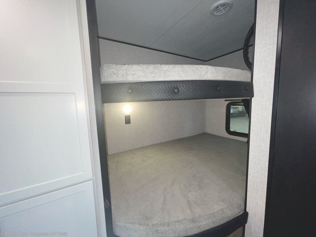 You can comfortably sleep up to ten people in this trailer thanks to the double-size bunks in back, the RV queen bed in the front bedroom, plus the booth dinette and jack-knife sofa in the main living area! The chef of your crew will have a three burner cooktop and microwave oven to prepare meals, and everyone can store their favorite drinks in the 8 cu. ft. 12V refrigerator inside, or in the outdoor refrigerator for convenience. The rear corner bathroom includes a tub/shower and a toilet, with the sink just outside of this room so others can brush their teeth if one is taking a shower before bed. The outside storage is accessible on both sides of the unit and will easily allow you bring along camp chairs, yard games and more. A 16' powered awning with LED lights will create a nice place to gather in the evenings with family and friends!