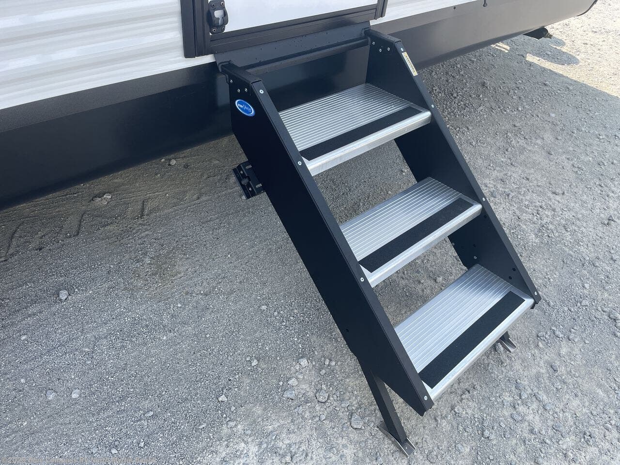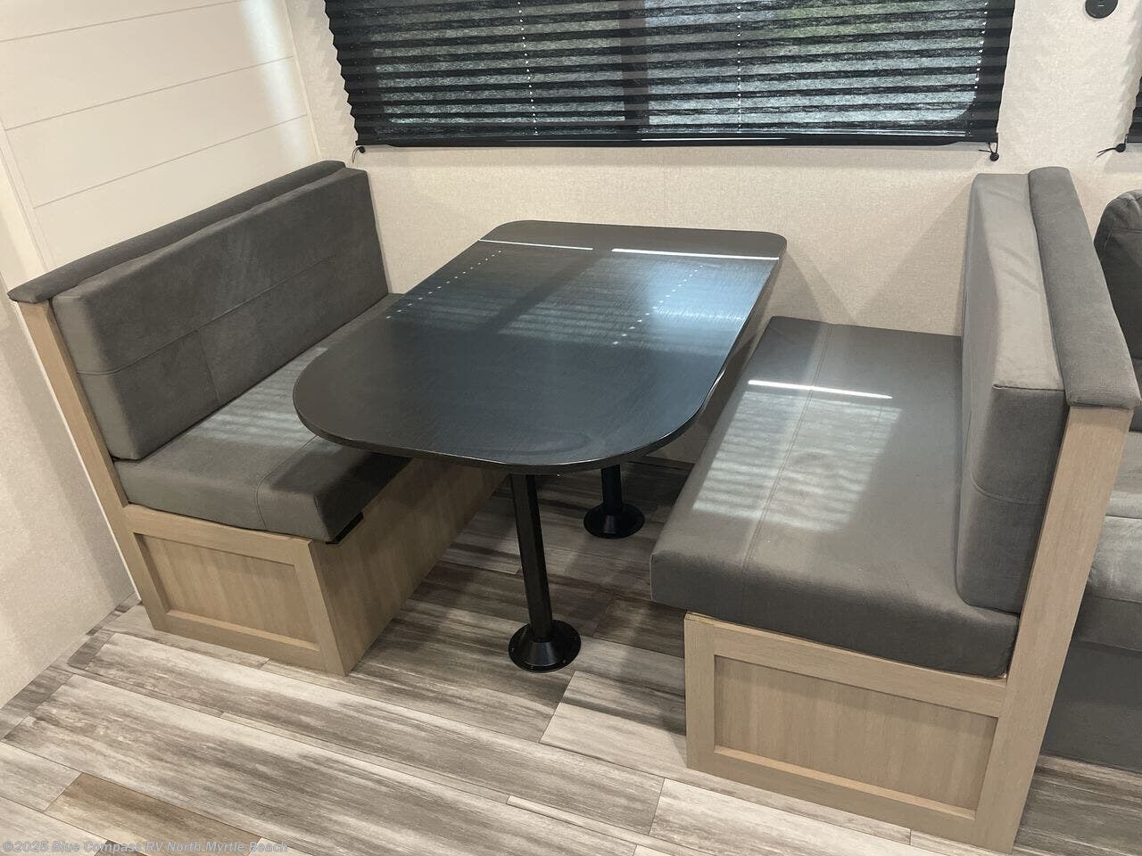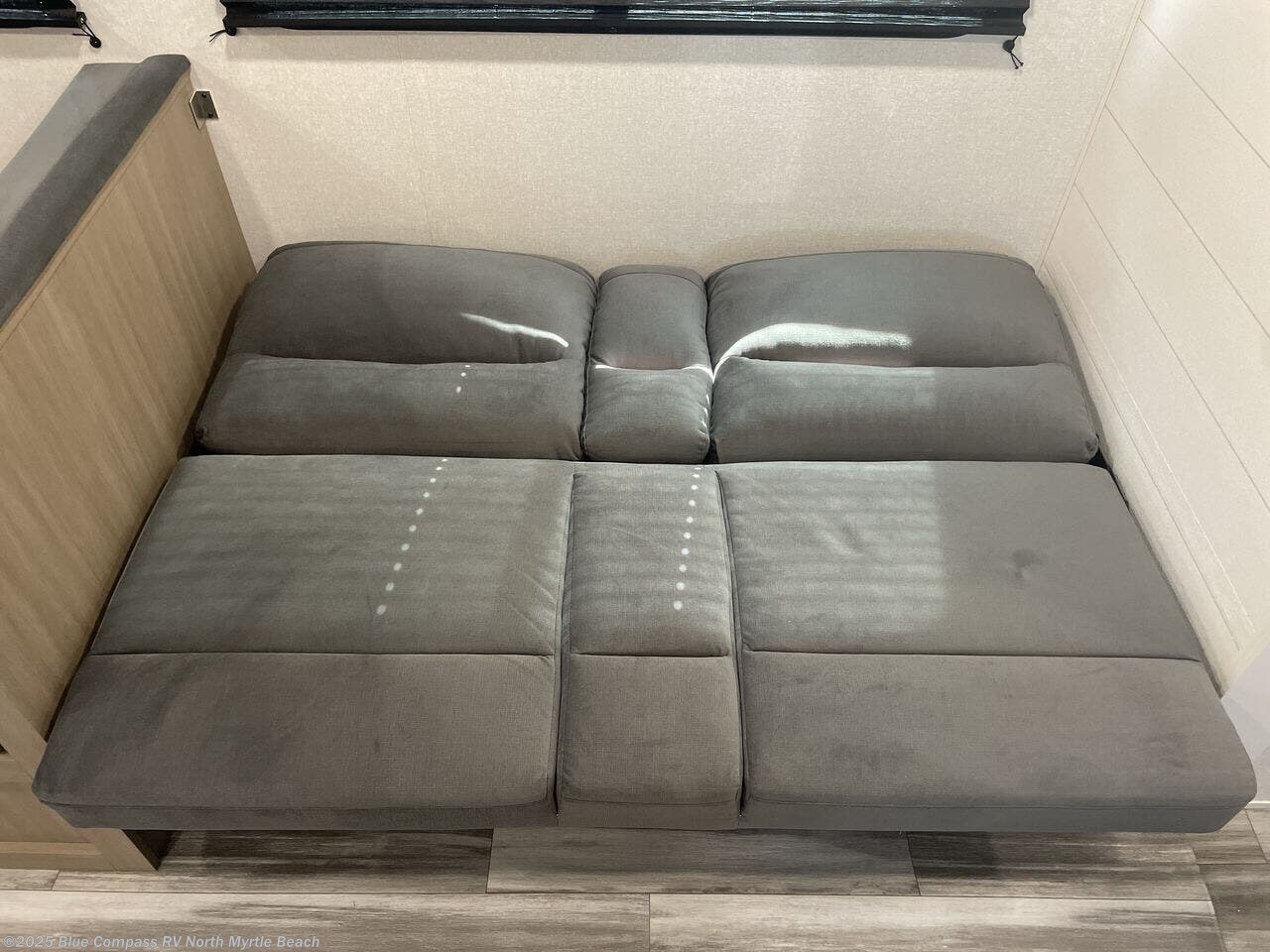 You can comfortably sleep up to ten people in this trailer thanks to the double-size bunks in back, the RV queen bed in the front bedroom, plus the booth dinette and jack-knife sofa in the main living area! The chef of your crew will have a three burner cooktop and microwave oven to prepare meals, and everyone can store their favorite drinks in the 8 cu. ft. 12V refrigerator inside, or in the outdoor refrigerator for convenience. The rear corner bathroom includes a tub/shower and a toilet, with the sink just outside of this room so others can brush their teeth if one is taking a shower before bed. The outside storage is accessible on both sides of the unit and will easily allow you bring along camp chairs, yard games and more. A 16' powered awning with LED lights will create a nice place to gather in the evenings with family and friends!