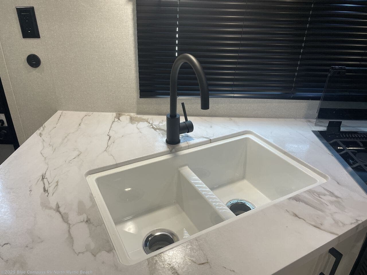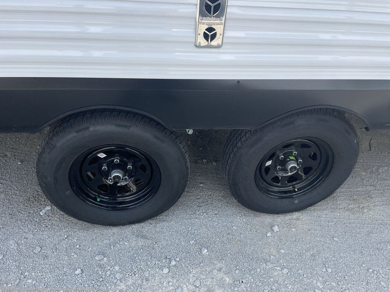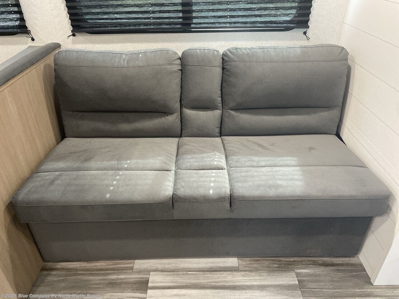 You can comfortably sleep up to ten people in this trailer thanks to the double-size bunks in back, the RV queen bed in the front bedroom, plus the booth dinette and jack-knife sofa in the main living area! The chef of your crew will have a three burner cooktop and microwave oven to prepare meals, and everyone can store their favorite drinks in the 8 cu. ft. 12V refrigerator inside, or in the outdoor refrigerator for convenience. The rear corner bathroom includes a tub/shower and a toilet, with the sink just outside of this room so others can brush their teeth if one is taking a shower before bed. The outside storage is accessible on both sides of the unit and will easily allow you bring along camp chairs, yard games and more. A 16' powered awning with LED lights will create a nice place to gather in the evenings with family and friends!