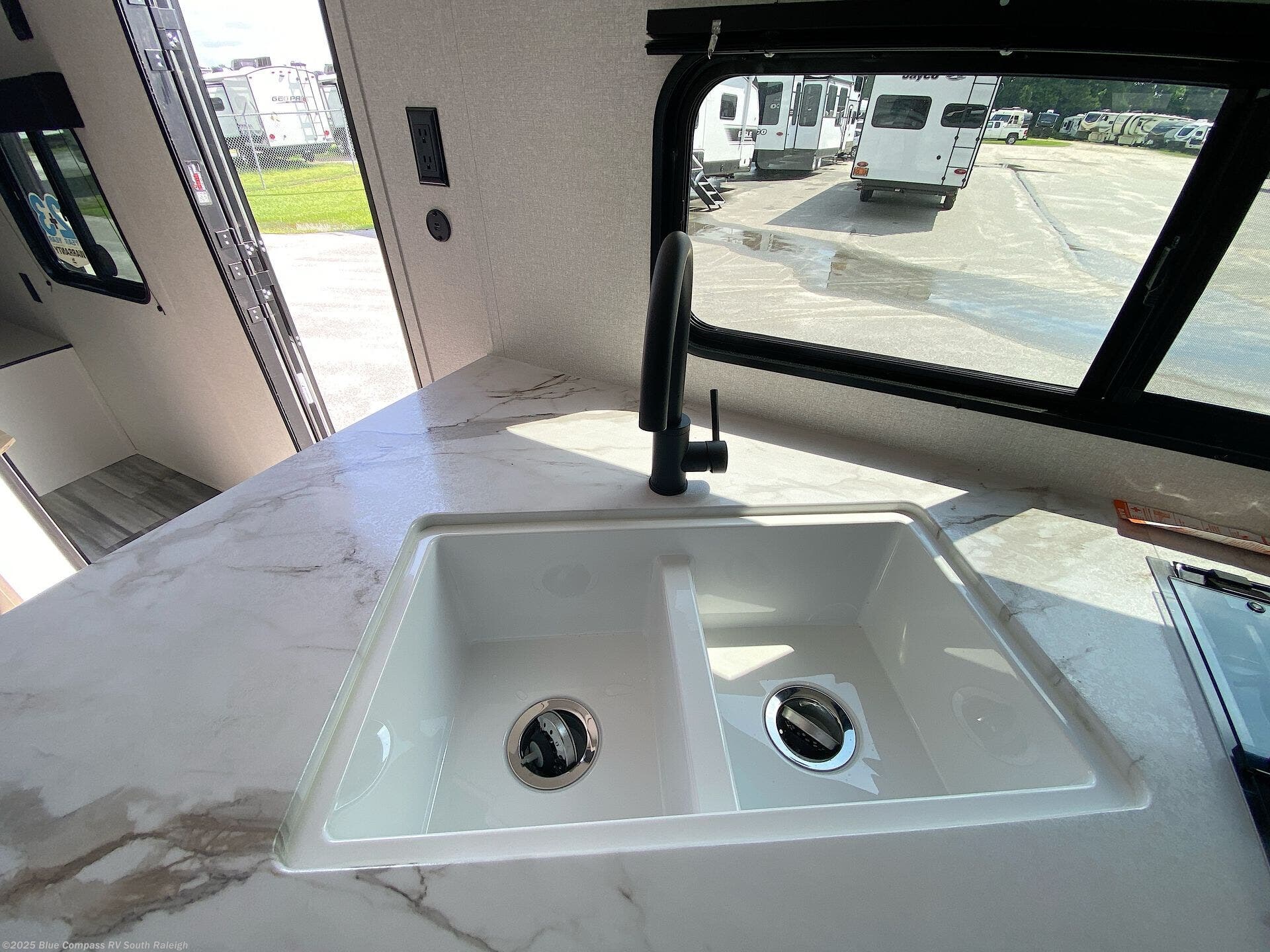 You can comfortably sleep up to ten people in this trailer thanks to the double-size bunks in back, the RV queen bed in the front bedroom, plus the booth dinette and jack-knife sofa in the main living area! The chef of your crew will have a three burner cooktop and microwave oven to prepare meals, and everyone can store their favorite drinks in the 8 cu. ft. 12V refrigerator inside, or in the outdoor refrigerator for convenience. The rear corner bathroom includes a tub/shower and a toilet, with the sink just outside of this room so others can brush their teeth if one is taking a shower before bed. The outside storage is accessible on both sides of the unit and will easily allow you bring along camp chairs, yard games and more. A 16' powered awning with LED lights will create a nice place to gather in the evenings with family and friends!