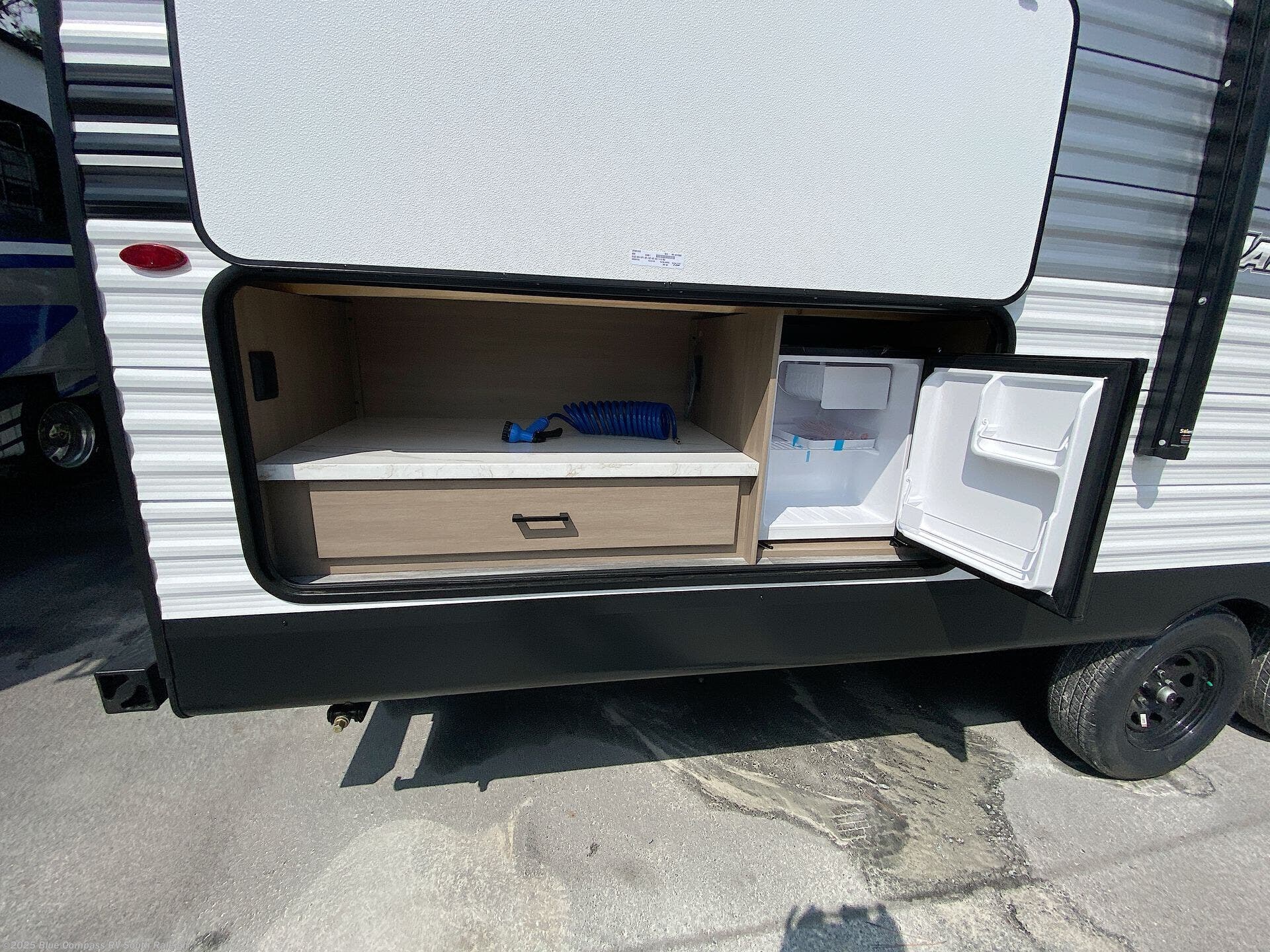 The Jayco Jay Flight SLX travel trailer is quite easy to own because it is lightweight for an easier towing experience. Built on a fully integrated A-frame with galvanized-steel, impact-resistant wheel wells, the Jay Flight SLX has quality at its very foundation. That quality continues on to the electric self-adjusting brakes, easy-lube hubs, Magnum Truss roof system, and LP quick connect. Some of what the mandatory Customer Value Package includes is backup camera prep, Keyed-Alike entry and baggage doors, marine grade exterior speakers, and an on-demand tankless water heater.