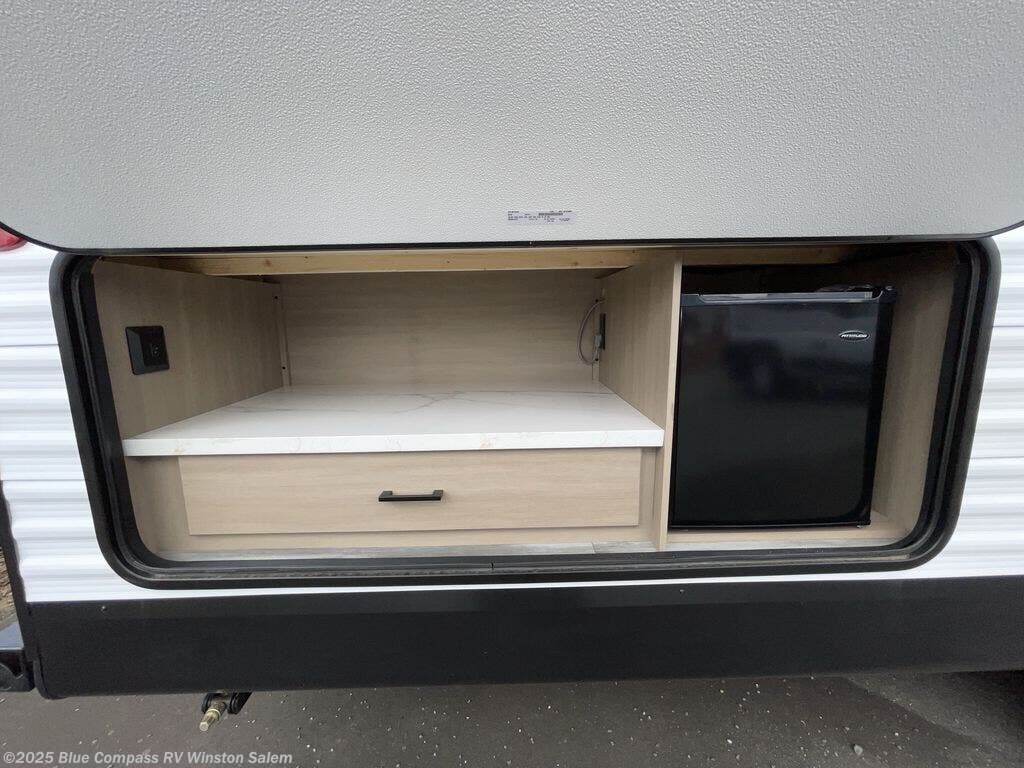 You can comfortably sleep up to ten people in this trailer thanks to the double-size bunks in back, the RV queen bed in the front bedroom, plus the booth dinette and jack-knife sofa in the main living area! The chef of your crew will have a three burner cooktop and microwave oven to prepare meals, and everyone can store their favorite drinks in the 8 cu. ft. 12V refrigerator inside, or in the outdoor refrigerator for convenience. The rear corner bathroom includes a tub/shower and a toilet, with the sink just outside of this room so others can brush their teeth if one is taking a shower before bed. The outside storage is accessible on both sides of the unit and will easily allow you bring along camp chairs, yard games and more. A 16' powered awning with LED lights will create a nice place to gather in the evenings with family and friends!