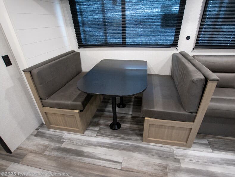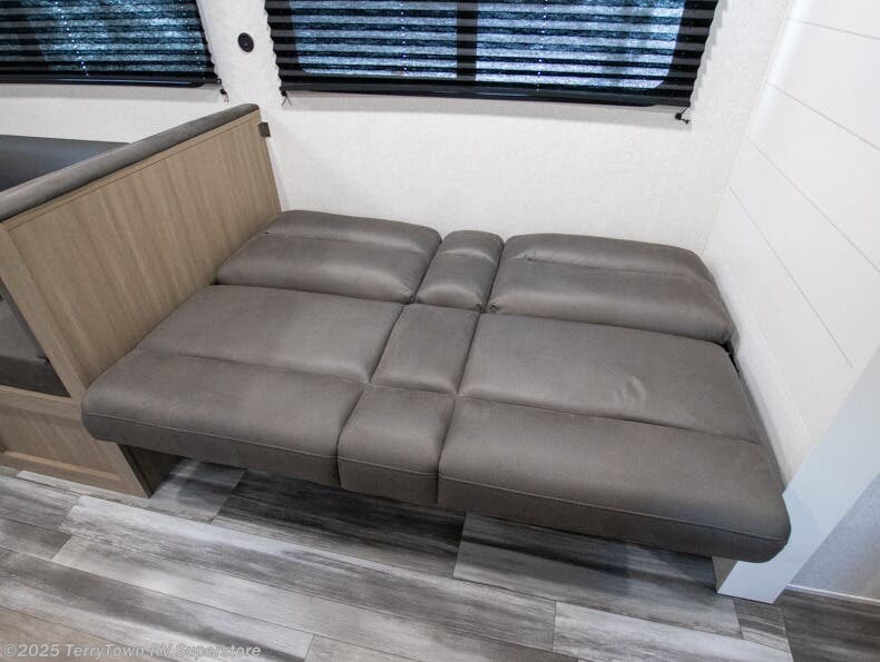 You can comfortably sleep up to ten people in this trailer thanks to the double-size bunks in back, the RV queen bed in the front bedroom, plus the booth dinette and jack-knife sofa in the main living area! The chef of your crew will have a three burner cooktop and microwave oven to prepare meals, and everyone can store their favorite drinks in the 8 cu. ft. 12V refrigerator inside, or in the outdoor refrigerator for convenience. The rear corner bathroom includes a tub/shower and a toilet, with the sink just outside of this room so others can brush their teeth if one is taking a shower before bed. The outside storage is accessible on both sides of the unit and will easily allow you bring along camp chairs, yard games and more. A 16' powered awning with LED lights will create a nice place to gather in the evenings with family and friends!