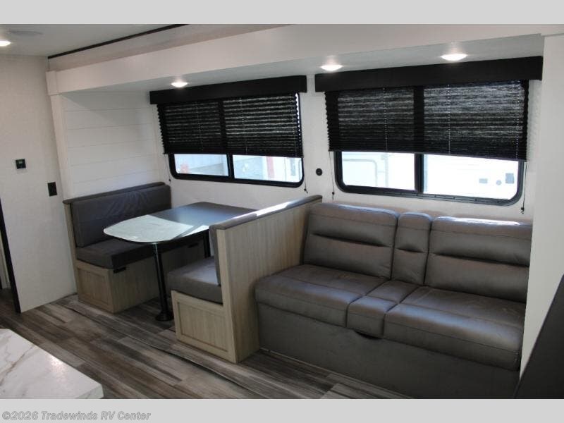 You can comfortably sleep up to ten people in this trailer thanks to the double-size bunks in back, the RV queen bed in the front bedroom, plus the booth dinette and jack-knife sofa in the main living area! The chef of your crew will have a three burner cooktop and microwave oven to prepare meals, and everyone can store their favorite drinks in the 8 cu. ft. 12V refrigerator inside, or in the outdoor refrigerator for convenience. The rear corner bathroom includes a tub/shower and a toilet, with the sink just outside of this room so others can brush their teeth if one is taking a shower before bed. The outside storage is accessible on both sides of the unit and will easily allow you bring along camp chairs, yard games and more. A 16' powered awning with LED lights will create a nice place to gather in the evenings with family and friends!