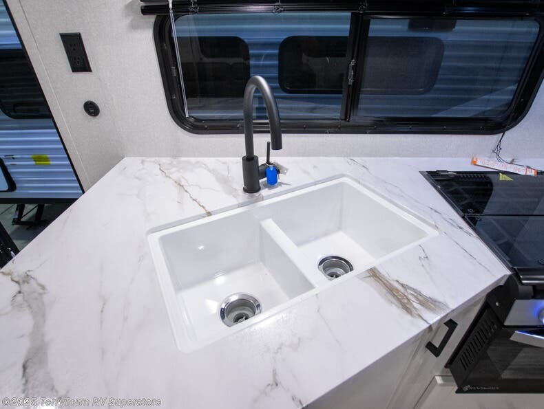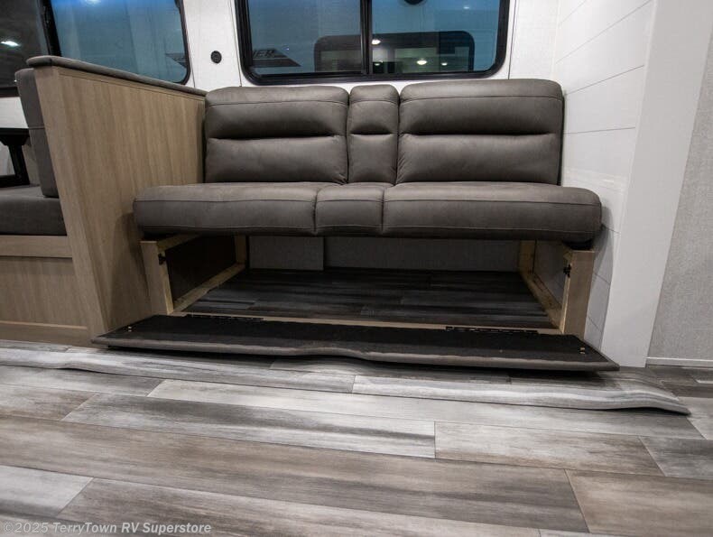 You can comfortably sleep up to ten people in this trailer thanks to the double-size bunks in back, the RV queen bed in the front bedroom, plus the booth dinette and jack-knife sofa in the main living area! The chef of your crew will have a three burner cooktop and microwave oven to prepare meals, and everyone can store their favorite drinks in the 8 cu. ft. 12V refrigerator inside, or in the outdoor refrigerator for convenience. The rear corner bathroom includes a tub/shower and a toilet, with the sink just outside of this room so others can brush their teeth if one is taking a shower before bed. The outside storage is accessible on both sides of the unit and will easily allow you bring along camp chairs, yard games and more. A 16' powered awning with LED lights will create a nice place to gather in the evenings with family and friends!