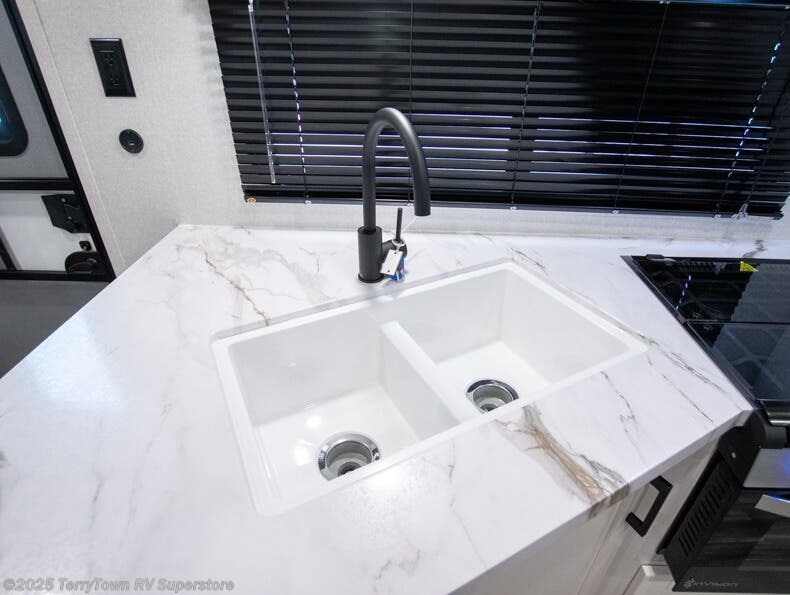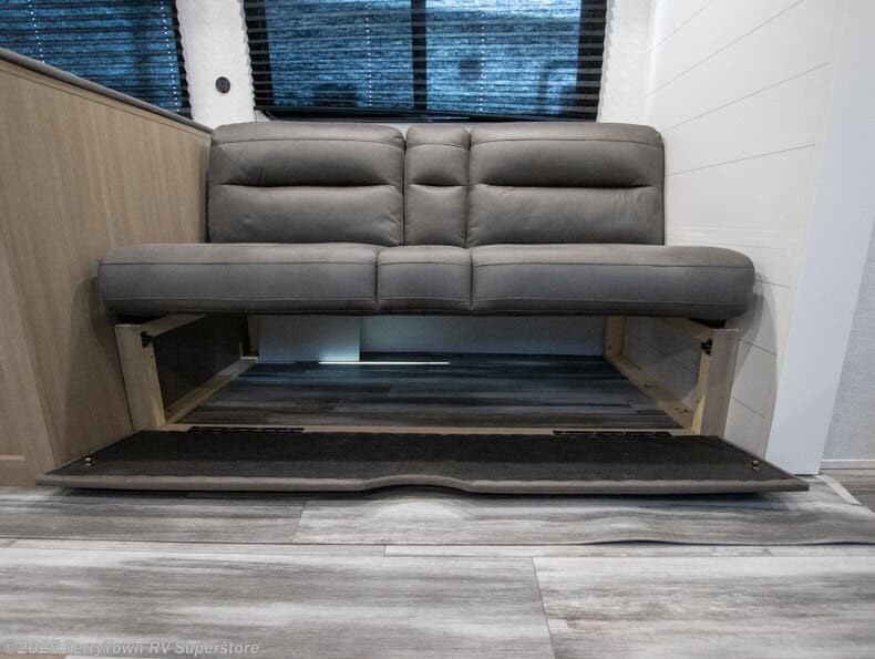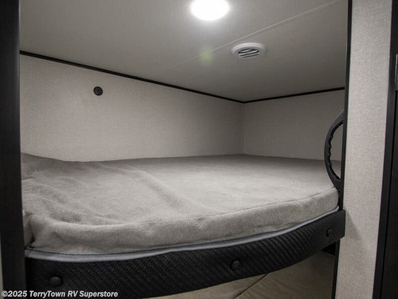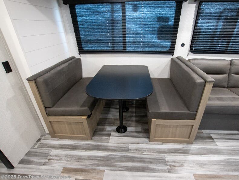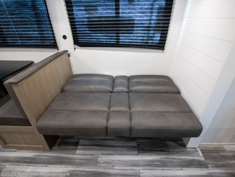 You can comfortably sleep up to ten people in this trailer thanks to the double-size bunks in back, the RV queen bed in the front bedroom, plus the booth dinette and jack-knife sofa in the main living area! The chef of your crew will have a three burner cooktop and microwave oven to prepare meals, and everyone can store their favorite drinks in the 8 cu. ft. 12V refrigerator inside, or in the outdoor refrigerator for convenience. The rear corner bathroom includes a tub/shower and a toilet, with the sink just outside of this room so others can brush their teeth if one is taking a shower before bed. The outside storage is accessible on both sides of the unit and will easily allow you bring along camp chairs, yard games and more. A 16' powered awning with LED lights will create a nice place to gather in the evenings with family and friends!