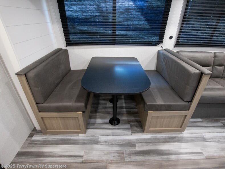 You can comfortably sleep up to ten people in this trailer thanks to the double-size bunks in back, the RV queen bed in the front bedroom, plus the booth dinette and jack-knife sofa in the main living area! The chef of your crew will have a three burner cooktop and microwave oven to prepare meals, and everyone can store their favorite drinks in the 8 cu. ft. 12V refrigerator inside, or in the outdoor refrigerator for convenience. The rear corner bathroom includes a tub/shower and a toilet, with the sink just outside of this room so others can brush their teeth if one is taking a shower before bed. The outside storage is accessible on both sides of the unit and will easily allow you bring along camp chairs, yard games and more. A 16' powered awning with LED lights will create a nice place to gather in the evenings with family and friends!